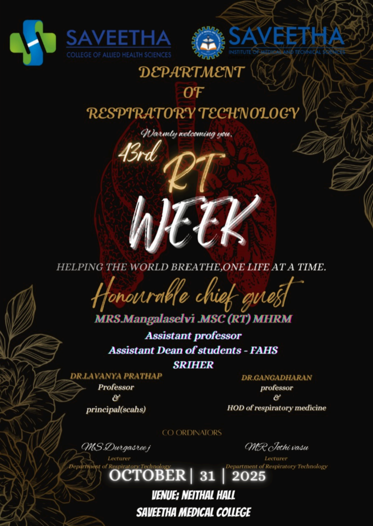 Saveetha College of Allied Health Sciences celebrated the 43rd Respiratory Therapy Week with enthusiasm. The event included an enlightening guest lecture, creative poster presentations, and fun learning activities such as quiz and connection games. Students actively participated, enhancing their clinical knowledge, teamwork, and communication skills. The celebration inspired future respiratory therapists towards excellence and professional growth.