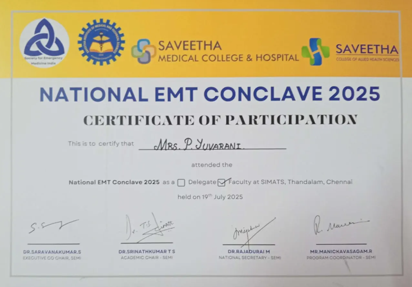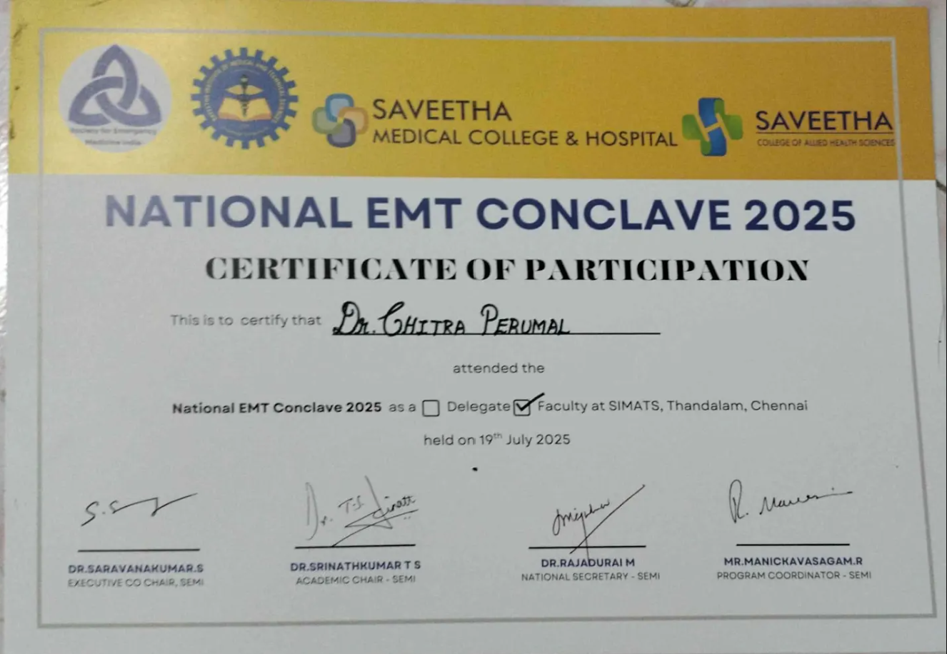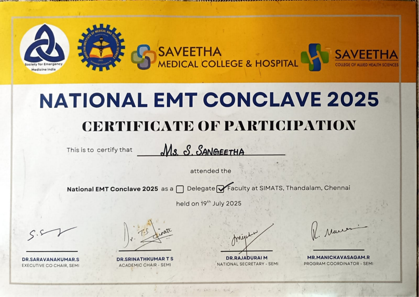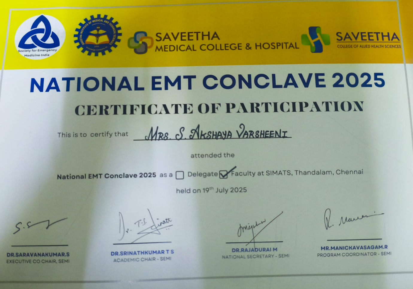 Saveetha Medical College successfully conducted the National EMT Conclave 2025 on July 19th, 2025, bringing together experts in emergency and trauma care. As part of this academic gathering, we were privileged to have [YUVARANI P] as an invited speaker, delivering a lecture on “Anaphylaxis – Recent Insights and Management.” The session highlighted the latest evidence-based approaches to recognition, diagnosis, and emergency management of anaphylaxis, emphasizing protocols vital for EMTs and healthcare providers. The talk was highly informative, fostering practical learning, improving preparedness for life-threatening emergencies, and serving as a key highlight of the scientific program.