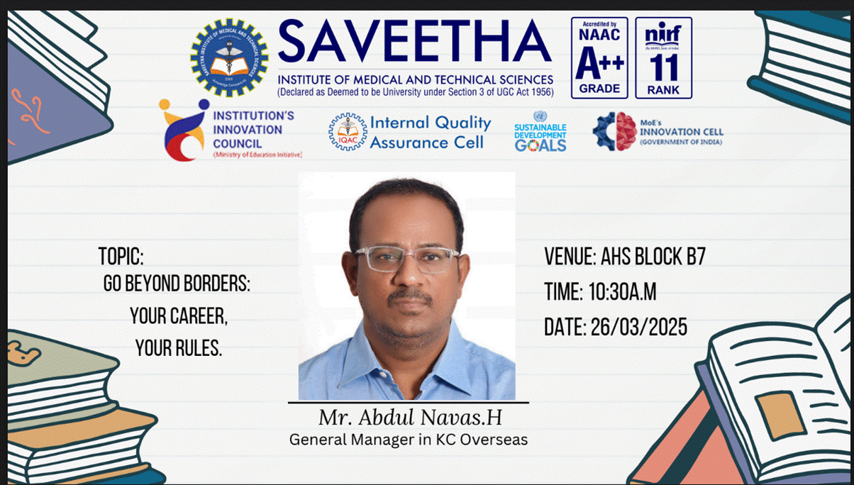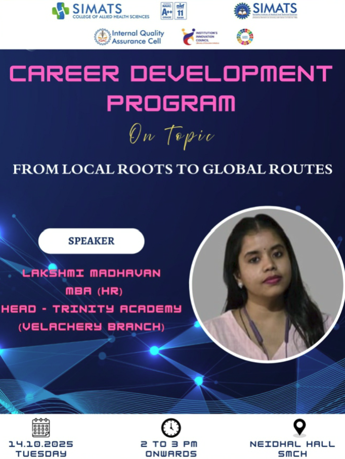 A Career Development Program titled “From Local Roots to Global Routes” was conducted on 14.10.2025 at Neidhal Hall, Saveetha Medical College and Hospital. The event was organized by the Internal Quality Assurance Cell, SIMATS College of Allied Health Sciences. The session was delivered by Ms. Lakshmi Madhavan, MBA (HR), Head of Trinity Academy, Velachery Branch. The talk focused on career growth strategies, global opportunities for Allied Health Science students, skill enhancement, and the importance of continuous learning in today's competitive world. Students actively participated and gained valuable insights on building professional profiles, improving communication skills, and preparing for global career pathways. The session motivated students to set clear career goals, develop leadership qualities, and embrace lifelong learning. The program concluded with a vote of thanks and appreciation to the speaker for her inspiring and informative session.