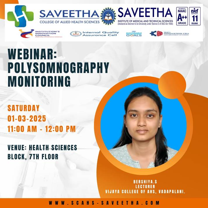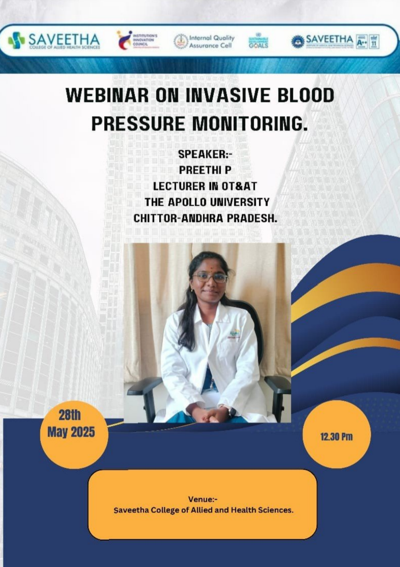 Saveetha College of Allied Health Sciences recently organized a webinar on the topic “Invasive Blood Pressure Monitoring”, aimed at enhancing the knowledge and clinical skills of students and healthcare professionals in advanced hemodynamic monitoring techniques. The session was led by an expert in the field, who provided in-depth insights into the principles, indications, equipment, and interpretation involved in invasive blood pressure monitoring. The webinar covered key aspects such as the advantages of invasive over non-invasive monitoring, catheter placement techniques, real-time waveform analysis, and complications to be aware of. It also highlighted the critical role of accurate blood pressure monitoring in intensive care settings and perioperative management.The session concluded with an interactive Q&A, allowing participants to clarify doubts and engage in case-based discussions. The event was well-received, with active participation from students, marking another successful step in bridging academic learning with clinical practice.