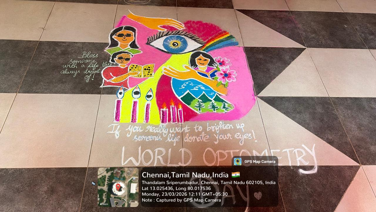 Saveetha College of Allied Health Sciences successfully conducted a World Optometry Day program on 23rd March 2026 in Chennai, Tamil Nadu. The event aimed to raise awareness about eye health and the importance of vision care. A vibrant and meaningful rangoli highlighted the message of eye donation, encouraging individuals to give the gift of sight. Students actively participated in spreading awareness through creative expression and educational initiatives. The program emphasized the role of optometrists in society and inspired the community to prioritize regular eye check-ups and support eye donation for a brighter, healthier future.