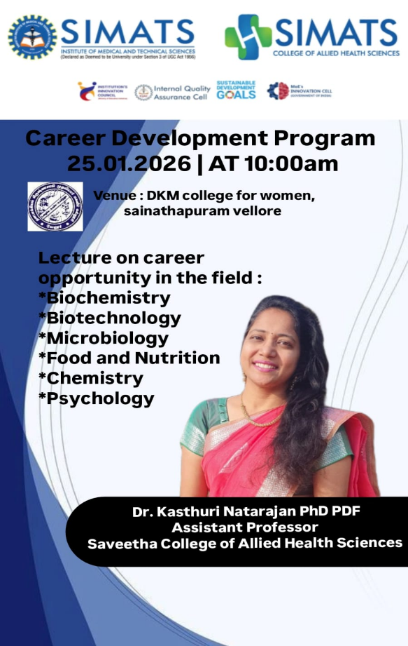 Prestigious to be an invited speaker for Career Development Program in DKM College for Women, Sainathapuram, Vellore, on 25-01-26 in an Alumni Meet 2026. Lecture on Career opportunities in the field of biochemistry, biotechnology, microbiology, food and nutrition, chemistry and psycology for the under graduates and post graduates students. This program highlight the career opportunities in various field like medical, industry, pharma sectors, clinical laboratories, research and development centres as well as explained about the importance of higher studies Doctorate of physiology in national and international institutions.