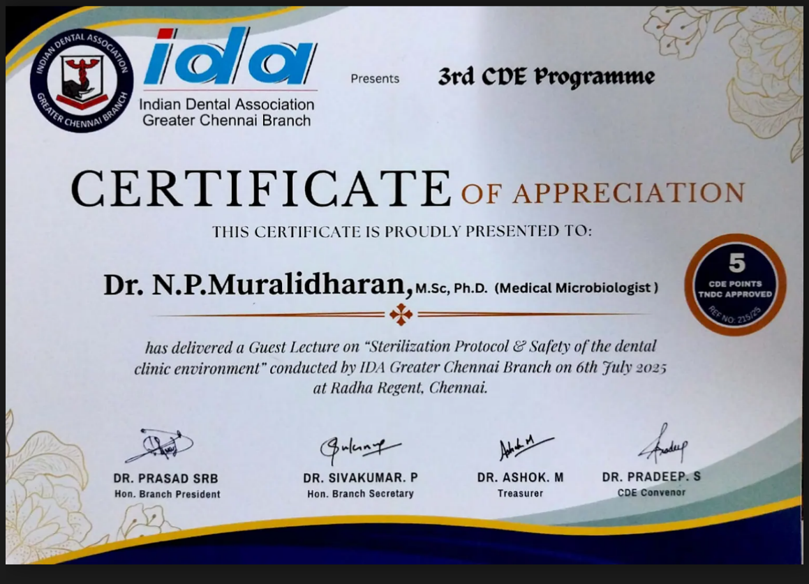 Dr. N. P. Muralidharan, M.Sc., Ph.D. (Medical Microbiologist), was honored with a Certificate of Appreciation by the Indian Dental Association, Greater Chennai Branch, for delivering an insightful guest lecture on “Sterilization Protocol & Safety of the Dental Clinic Environment.” The lecture was part of the 3rd CDE Programme conducted on 6th July 2025 at Radha Regent, Chennai. His presentation emphasized best practices in infection control, ensuring a safe and hygienic dental environment. His expertise and contribution to advancing knowledge in microbiology and clinical safety were highly appreciated by professionals and participants from the dental community.
