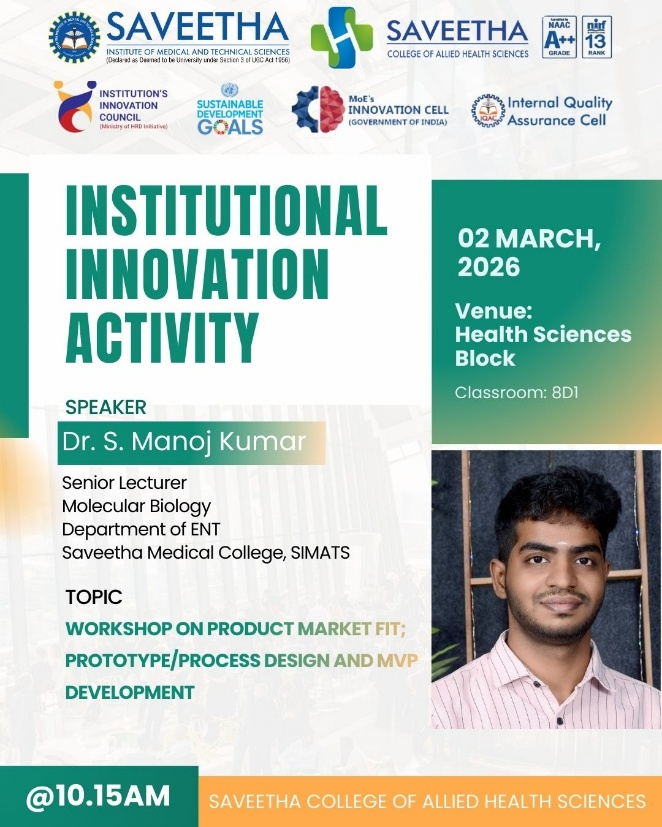 The Institutional Innovation Activity organized at Saveetha College of Allied Health Sciences on March 2, 2026, focused on fostering creativity and entrepreneurial thinking among students. The session was delivered by Dr. S. Manoj Kumar, Senior Lecturer in Molecular Biology, who shared valuable insights on product market fit, prototype development, and process design. The workshop aimed to bridge the gap between academic knowledge and real-world innovation by encouraging students to develop practical solutions. Conducted at the Health Sciences Block, the event provided an interactive platform for learning, collaboration, and idea generation, empowering participants to explore innovative approaches in healthcare and research.