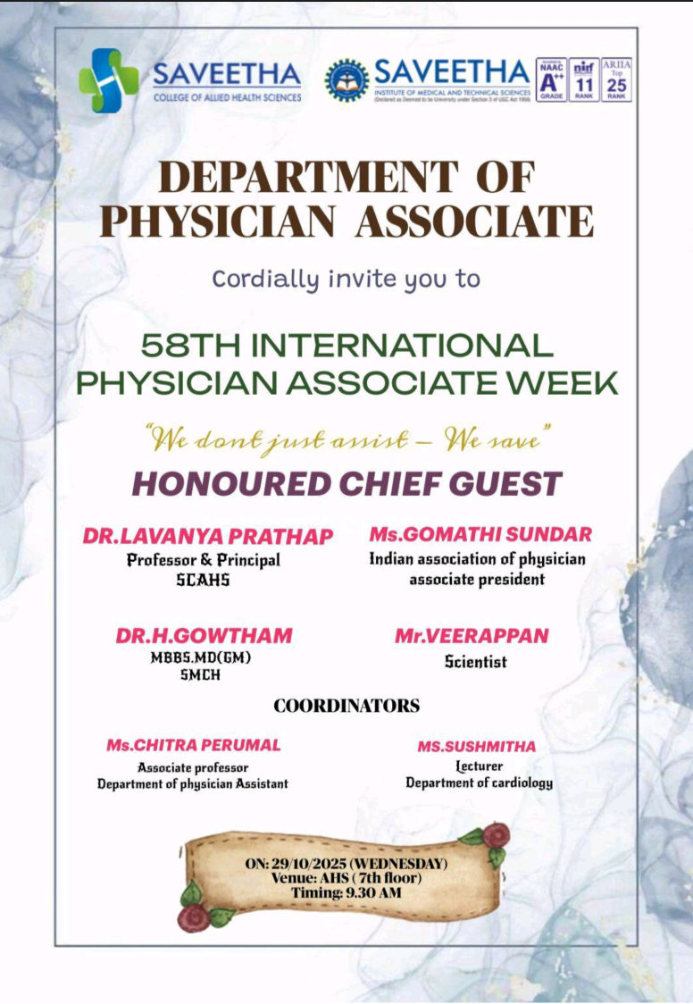 Physician Assistant Day was celebrated on 29/10/2025 by the students of Saveetha College of Allied Health Sciences at the college premises. Students enthusiastically participated in essay writing, quiz competitions, and poster presentations. Mrs. Lavanya Prathap, Principal of AHS, and Mrs. Gomathi Sundar from the Research Academy and member of NCAHP, presided over the function and delivered an insightful talk on the genesis of the PA cadre. Prizes were distributed to the winners, followed by a cake-cutting ceremony by the chief guest and the principal, along with faculty members and students. The event was remarkable and served as a valuable knowledge-sharing platform. Heartfelt thanks to the principal and management for providing the opportunity and facilities to celebrate the occasion. — Chitra Perumal, Associate Professor & PA In-charge, SCAHS.