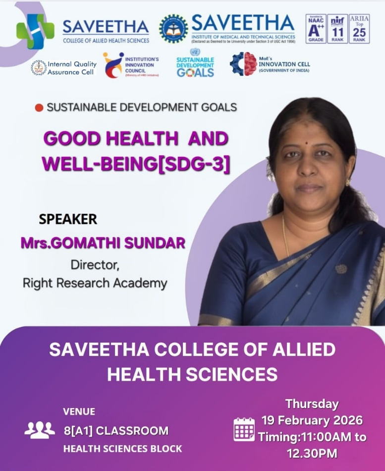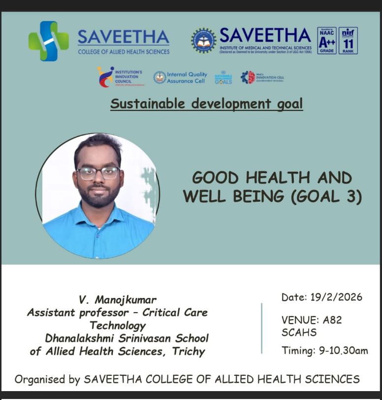 In alignment with Sustainable Development Goal 3 – Good Health and Well-Being, Saveetha College of Allied Health Sciences organized a Sustainable Development Programme on the topic “Importance of Early Dinner.” The program aimed to create awareness about the role of meal timing in promoting overall health and preventing lifestyle-related disorders. The session highlighted how early dinner habits support better digestion, improved sleep quality, hormonal balance, and effective blood sugar regulation. Emphasis was placed on consuming light, balanced meals at least two to three hours before bedtime to enhance metabolic function and reduce the risk of obesity, diabetes, and cardiovascular diseases. Participants were also educated about the connection between circadian rhythm, healthy eating patterns, and long-term well-being. The programme encouraged students and the community to adopt simple lifestyle modifications that can significantly improve physical and mental health. Through interactive discussions and evidence-based insights, the initiative reinforced the importance of preventive healthcare practices in achieving sustainable health outcomes. This event reflects the institution’s commitment to promoting holistic health awareness and contributing meaningfully to the global Sustainable Development Goals.