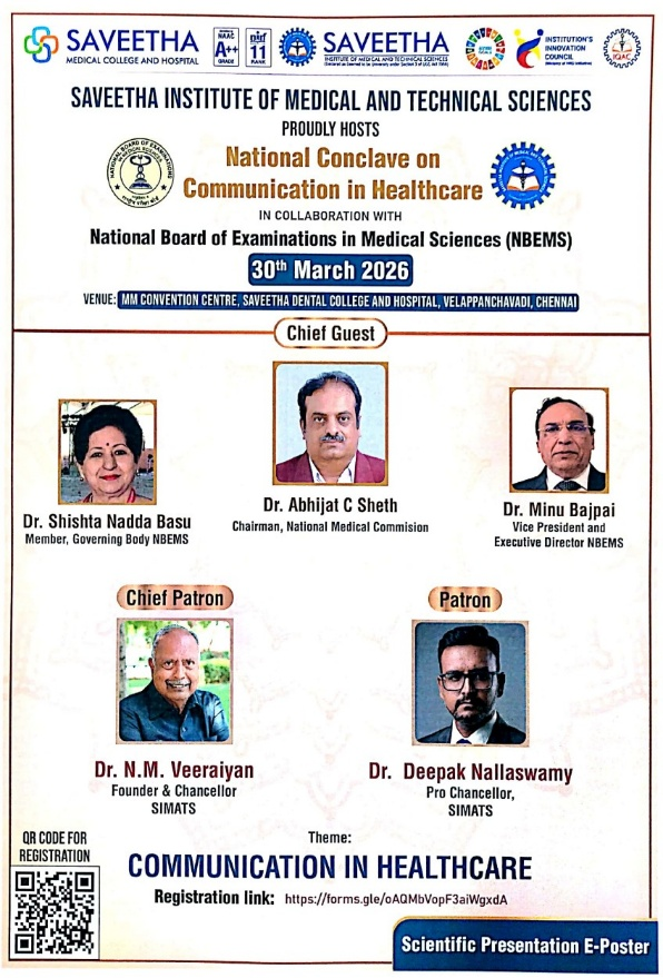 Saveetha Institute of Medical and Technical Sciences proudly organized a National Conclave on Communication in Healthcare on 30th March 2026 in collaboration with the National Board of Examinations in Medical Sciences (NBEMS). The event brought together distinguished leaders and experts from the healthcare sector to discuss the vital role of effective communication in patient care and medical practice. Eminent dignitaries, including chief guests and patrons, shared valuable insights and experiences. The conclave provided a platform for knowledge exchange, scientific presentations, and meaningful discussions, aiming to enhance healthcare delivery through improved communication, professionalism, and collaborative practices.