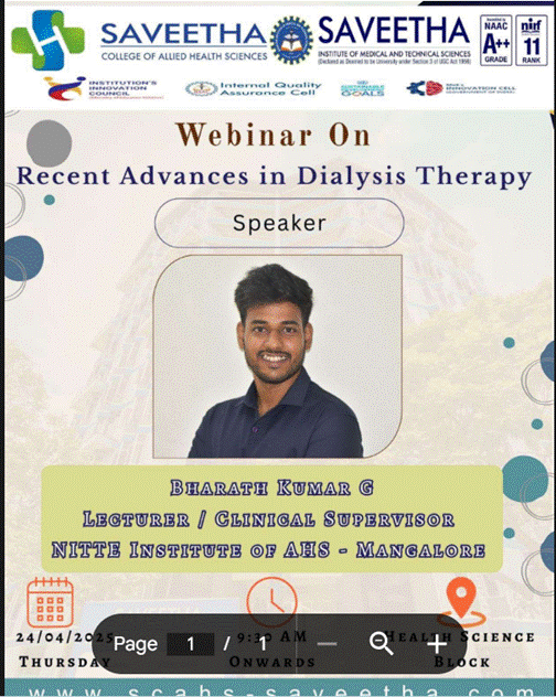 Saveetha College of Allied Health Sciences (SCAHS) organized a webinar on "Recent Advances in Dialysis Therapy" on April 24, 2025. The invited speaker for the session was Mr. Bharath Kumar G., Lecturer and Clinical Instructor at NITTE Institute of Allied Health Sciences, Mangalore. The seminar aimed to update faculty and students on the latest developments, technologies, and best practices in the field of dialysis therapy. Mr. Bharath Kumar shared his expertise on emerging trends, innovative techniques, and current challenges in dialysis care, providing valuable insights drawn from both academic research and clinical experience. His session was informative, thought-provoking, and highly relevant for healthcare professionals involved in nephrology and renal care.