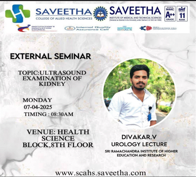 On April 7, 2025, Saveetha College of Allied Health Sciences (SCAHS) organized an insightful seminar on the topic of Ultrasound Examination of the Kidney. The session was conducted by Mr. Divakar V, a distinguished lecturer from the Department of Urology at Sri Ramachandra Institute of Higher Education and Research (SRIHER). Mr. Divakar shared his extensive knowledge and clinical expertise, providing students with a comprehensive understanding of the principles, techniques, and clinical applications of renal ultrasound. The seminar also highlighted the role of ultrasound in diagnosing various kidney-related conditions, enhancing the participants' practical and theoretical knowledge. The session proved to be highly informative and beneficial, especially for students pursuing careers in medical imaging and urology.