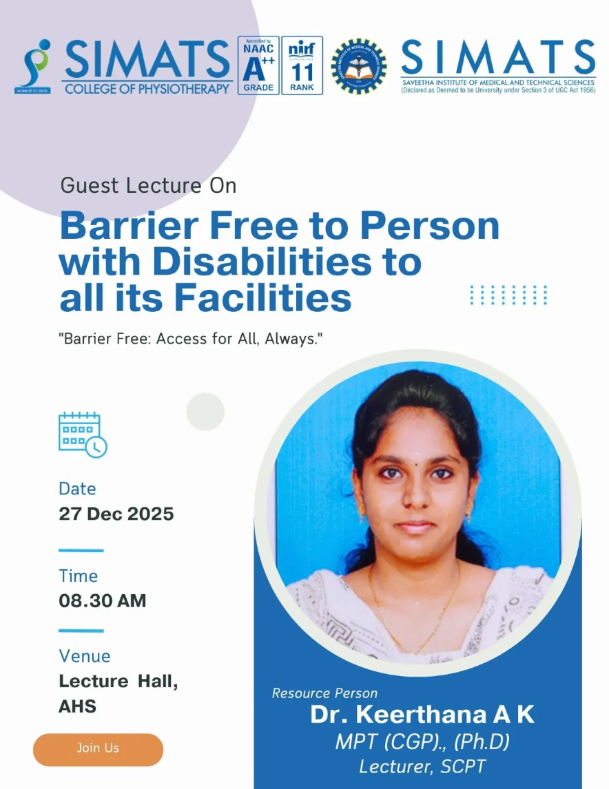 This lecture focused on the importance of making all facilities barrier-free for persons with disabilities. Barrier-free environments ensure equal access, safety, and independence for everyone, regardless of physical, sensory, or cognitive challenges. The session highlighted key features such as ramps, elevators, wide doorways, tactile paths, accessible restrooms, clear signage, and assistive technologies. It emphasized that accessibility is not a favor but a basic right that promotes dignity and inclusion. Creating barrier-free facilities benefits not only persons with disabilities but also elderly people, children, and others with temporary limitations, fostering a truly inclusive and welcoming society.