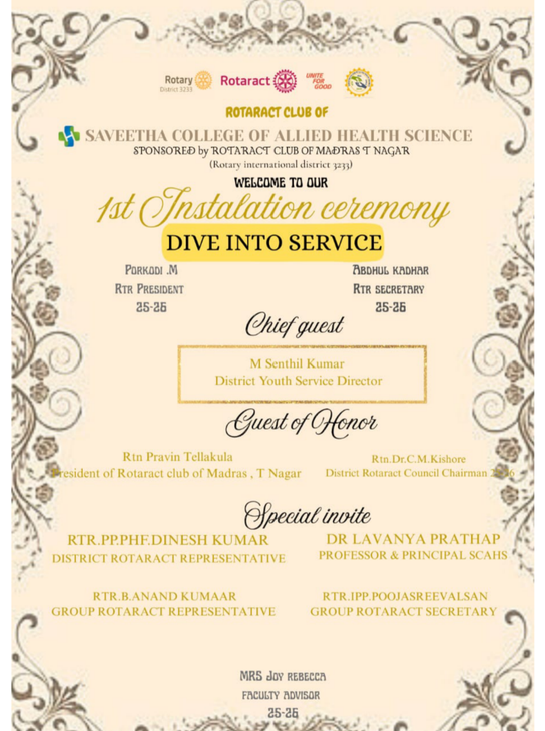 The 1st Installation Ceremony of the Rotaract Club of Saveetha College of Allied Health Sciences, sponsored by the Rotaract Club of Madras T Nagar (Rotary International District 3233), was conducted with great enthusiasm under the theme “Dive into Service.” The ceremony marked the official induction of the office bearers for the Rotary year 2025–2026, with Rtr. Porkodi M assuming office as President and Rtr. Abdhul Kadhar as Secretary. The event was graced by the Chief Guest, Mr. M. Senthil Kumar, District Youth Service Director, whose address inspired young Rotaractors to embrace leadership and community service. The presence of distinguished Guests of Honour and Rotaract dignitaries added significance to the occasion. The ceremony reinforced the club’s commitment to service, leadership development, and social responsibility, setting a strong foundation for impactful initiatives ahead.