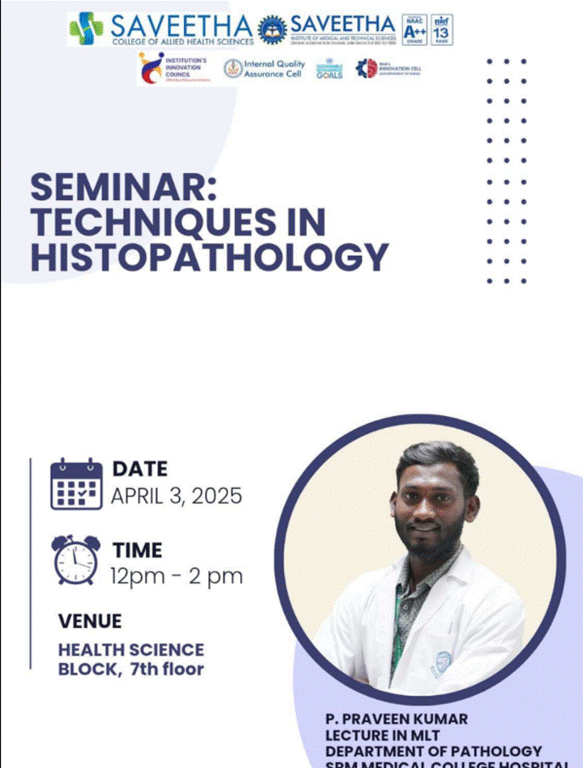 Saveetha College of Allied Health Sciences recently organized an enlightening seminar on the topic "Techniques in Histopathology." The event aimed to enhance the knowledge and practical understanding of students in the field of histopathology, a critical branch of pathology concerned with the microscopic examination of tissue to study the manifestations of disease. The seminar was led by Mr. Praveen Kumar, a distinguished lecturer from SRM Medical College Hospital and Research Centre. With his extensive expertise and academic experience, Mr. Praveen Kumar provided in-depth insights into various histopathological techniques, including tissue processing, staining methods, and slide interpretation. His engaging presentation and real-time examples greatly benefited the participants, enriching their theoretical foundation and encouraging them to explore advancements in diagnostic pathology. The session concluded with an interactive Q&A, where students had the opportunity to clarify their doubts and discuss current trends in histopathological practices. The seminar proved to be a valuable learning experience and received positive feedback from all attendees.