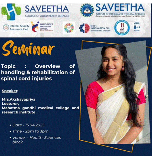 Saveetha College of Allied Health Sciences (SCAHS)organized an insightful seminar on *"An Overview of Handling and Rehabilitation of Spinal Cord Injuries" on 15th April 2025. The session was delivered by Mrs. Akshayapriya, Lecturer in the Department of NeuroElectrophysiology (NEP). The seminar aimed to enhance students’ understanding of the assessment, management, and rehabilitation approaches for individuals with spinal cord injuries, highlighting both theoretical and practical perspectives. Mrs. Akshayapriya shared her valuable expertise, discussing the latest advancements and interdisciplinary approaches in the rehabilitation process, which was highly informative and beneficial for all attendees.