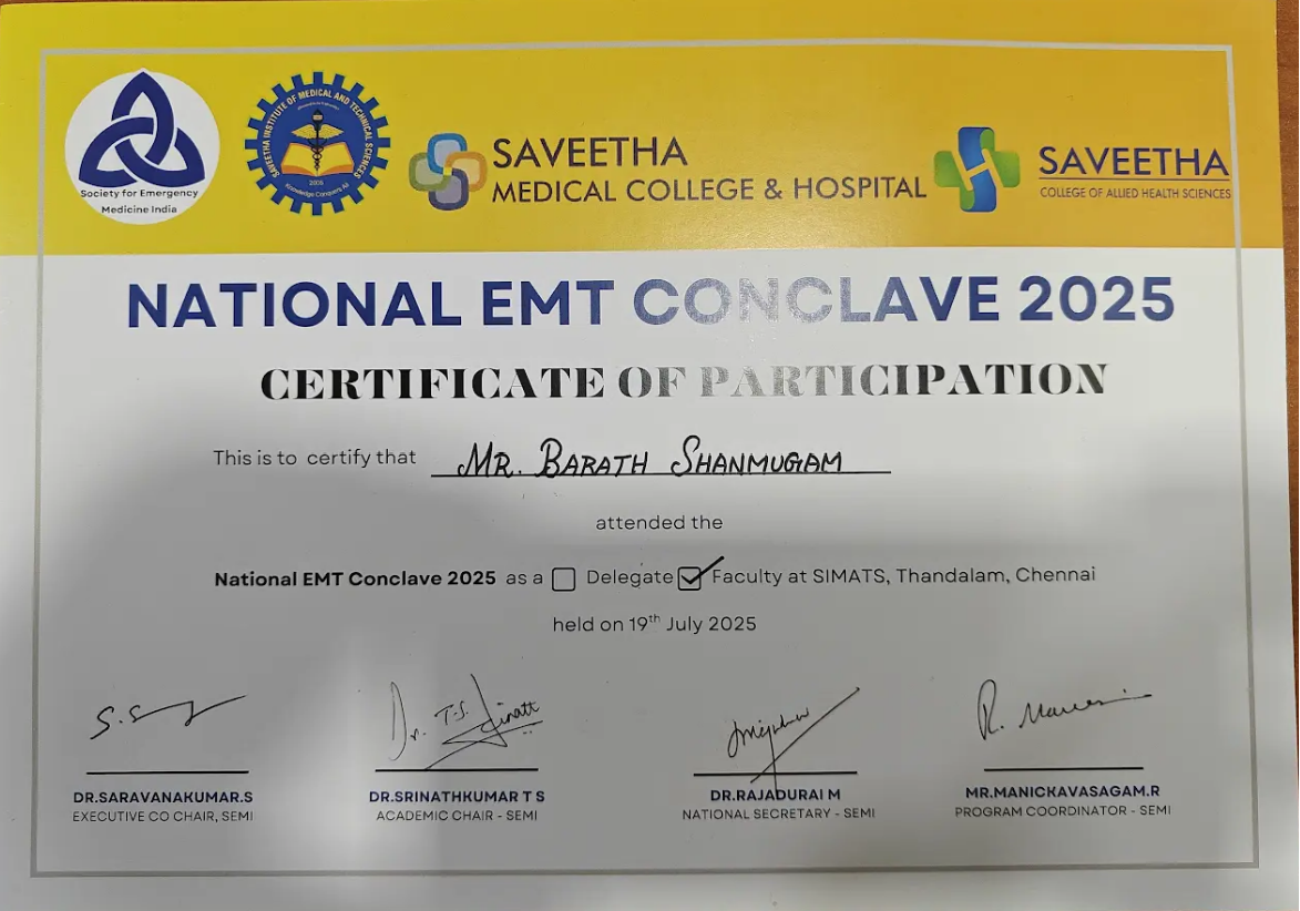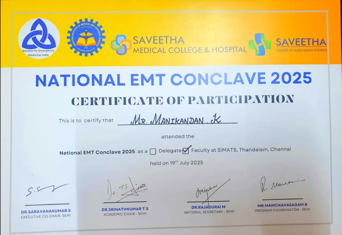 Saveetha Medical College proudly hosted the National EMT Conclave 2025 on July 19th, 2025, bringing together experts and professionals in emergency medicine. As part of this prestigious event, we were privileged to have [MANIKANDAN K] deliver an invited lecture on “Recent Updates in ATLS.” The session provided a comprehensive overview of the latest advancements in trauma care, emphasizing evidence-based protocols and clinical applications relevant to EMTs and healthcare providers. The insightful talk enriched participants’ knowledge, enhanced their preparedness for critical situations, and fostered academic exchange, marking a significant highlight of the conclave’s scientific program.