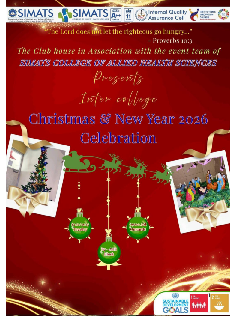 The SIMATS College of Allied Health Sciences, in association with the Club House and Event Team, proudly presents the Inter-College Christmas & New Year 2026 Celebration. The event reflects the spirit of gratitude, compassion, and togetherness that defines the festive season. The celebration will be held on Tuesday, 23rd December 2025, from 9:00 AM onwards at the B7 – AHS Block. It brings together students and faculty from various institutions to celebrate Christmas and welcome the New Year in a joyful and inclusive atmosphere. With cultural performances, festive décor, and shared moments of reflection, the event promotes unity, peace, and goodwill. Aligned with the Sustainable Development Goals, the celebration encourages community bonding and well-being, making it a meaningful occasion to end the year on a positive note and begin the New Year with renewed hope.