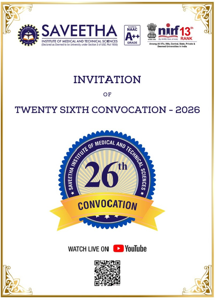 Saveetha Institute of Medical and Technical Sciences cordially invites you to the Twenty Sixth Convocation Ceremony 2026. This prestigious occasion celebrates the academic achievements and dedication of graduating students as they step into the next phase of their professional journeys. The ceremony reflects excellence in education, perseverance, and commitment to knowledge. With esteemed dignitaries, faculty, and proud families in attendance, the event promises to be a memorable milestone. Join us in honoring the graduates and witnessing this significant moment, live on YouTube, as we celebrate success, growth, and the bright futures ahead.