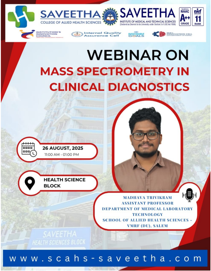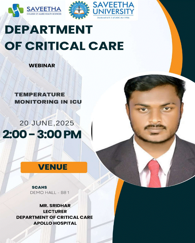 The Saveetha College of Allied Health Sciences (SCAHS) successfully conducted a webinar on June 20, 2025, focusing on the topic "Temperature Monitoring in the ICU." The session was delivered by Mr. Sridhar, a lecturer in Critical Care at the Apollo Group of Institutions, Vanagaram. The informative webinar provided valuable insights into the importance, methods, and best practices of temperature monitoring in intensive care settings, emphasizing its role in improving patient outcomes. The event was well-received by students and healthcare professionals, fostering academic engagement and practical understanding of critical care protocols.