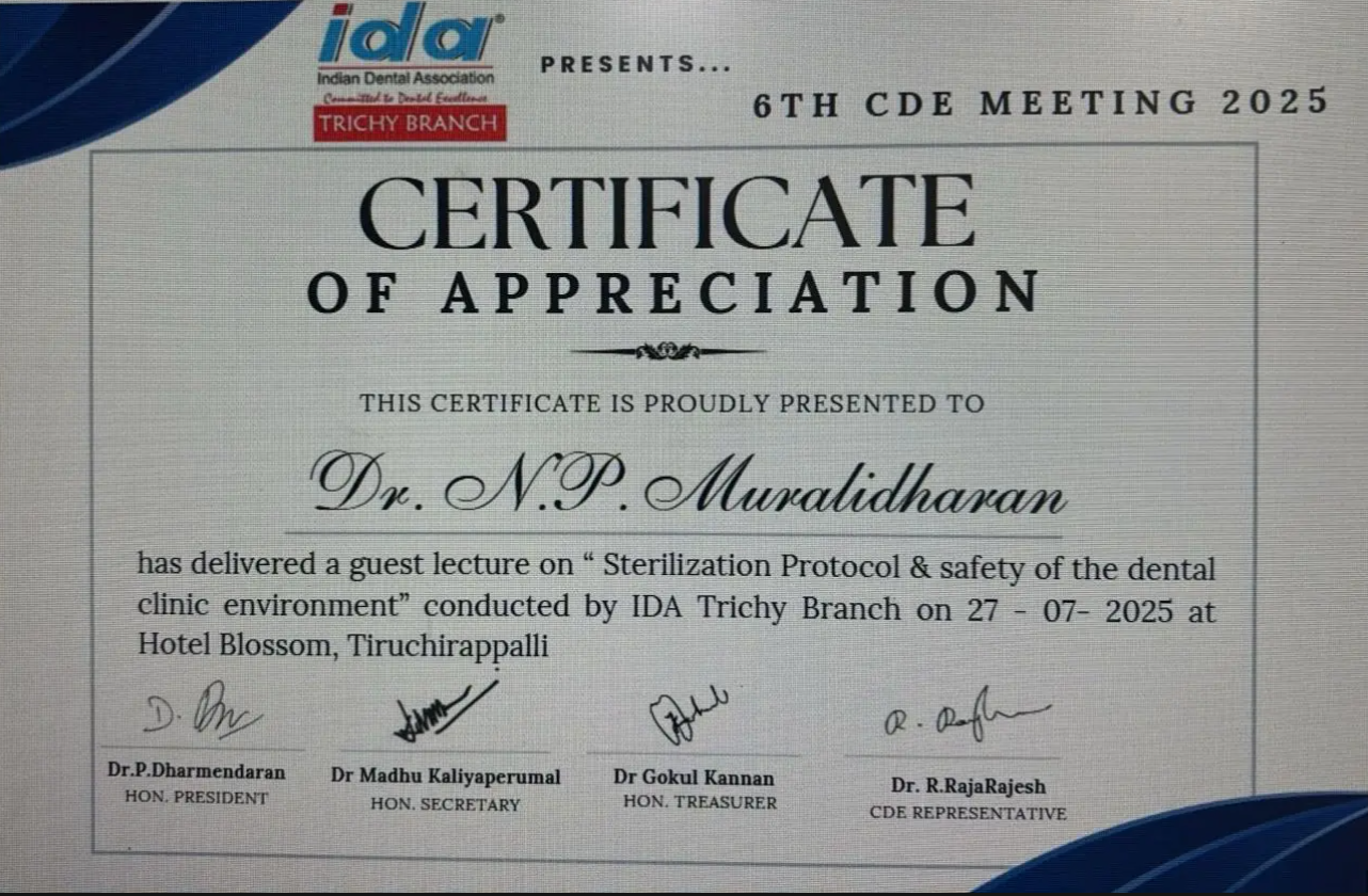 Dr. N. P. Muralidharan, M.Sc., Ph.D. (Medical Microbiologist), received a Certificate of Appreciation from the Indian Dental Association, Trichy Branch, for delivering a guest lecture on “Sterilization Protocol and Safety of the Dental Clinic Environment.” The lecture was part of the 6th CDE Meeting 2025 held on 27th July 2025 at Hotel Blossom, Tiruchirappalli. His presentation emphasized the importance of infection control, sterilization standards, and maintaining a safe clinical setting for dental professionals and patients. His valuable insights and contributions were highly appreciated by the dental fraternity for enhancing knowledge and promoting safe clinical practices.