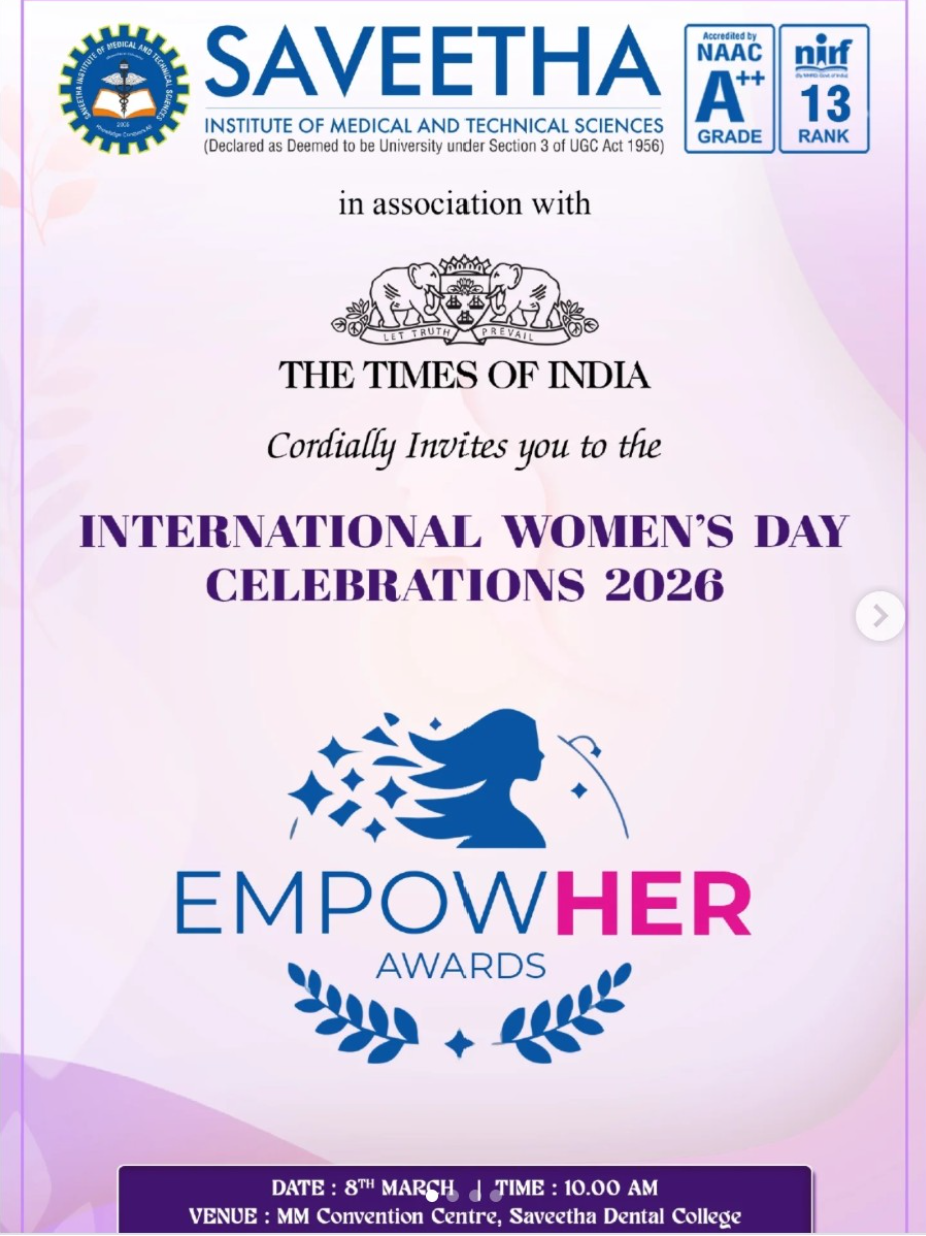 Saveetha Institute of Medical and Technical Sciences, in association with The Times of India, proudly hosts the International Women's Day Celebrations 2026. The event honors women's achievements, resilience, and leadership across diverse fields. Featuring the EMPOWHER Awards, it recognizes inspiring individuals who create meaningful impact in society. The celebration brings together students, professionals, and changemakers to share ideas, stories, and aspirations. Through engaging sessions and recognition, it aims to empower, uplift, and inspire future generations to lead with confidence and purpose, fostering equality, innovation, and inclusive growth for all women everywhere in every sphere of life and community development worldwide.