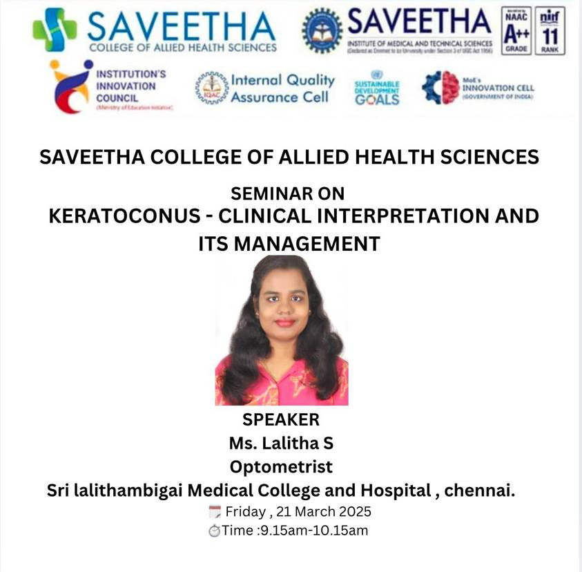 On March 21, 2025, Saveetha College of Allied Health Sciences (SCAHS) organized a seminar focused on the topic of "Keratoconus – Clinical Interpretation and Its Management." The seminar was led by Lalitha S, a skilled and experienced optometrist from Sri Lalithambigai Medical College and Hospital. During the session, Lalitha S provided an in-depth exploration of keratoconus, a progressive eye disorder that affects the cornea, leading to distorted vision. The seminar covered the clinical aspects of diagnosing keratoconus, with a particular focus on understanding its early signs and symptoms, as well as its progression.