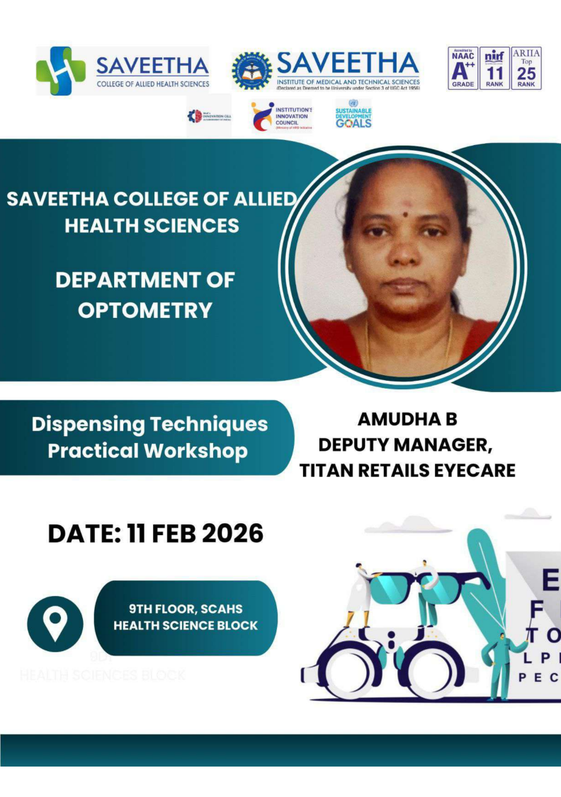 The Department of Optometry, Saveetha College of Allied Health Sciences, successfully organized a Dispensing Techniques Practical Workshop on 11th February 2026 at the 9th Floor, SCAHS Health Science Block. The session was led by Ms. Amudha B, Deputy Manager, Titan Retails Eyecare, who shared valuable industry insights and hands-on expertise in optical dispensing.