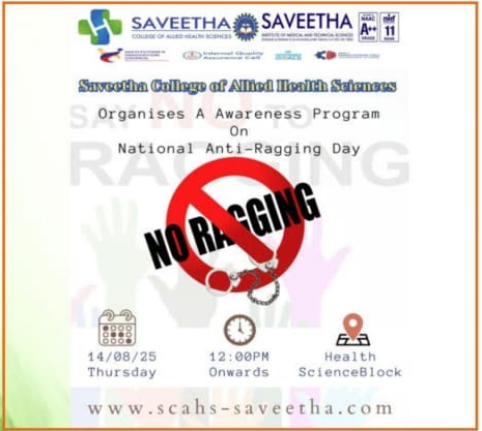 Anti-Ragging Day awareness program organized by Saveetha College of Allied Health Sciences under SIMATS. The left panel displays an event poster featuring the “No Ragging” symbol, along with details such as the date, time, and venue of the program scheduled on 14 August 2025 at the Health Science Block. The right panel shows students in uniform gathered in a classroom, taking an anti-ragging pledge during the awareness session. The atmosphere reflects discipline and participation, emphasizing the institution’s commitment to creating a safe, respectful, and supportive campus environment free from ragging practices.