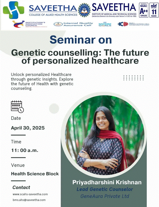 On April 30, 2025, the School of Clinical and Allied Health Sciences (SCAHS) organized an enlightening seminar on the topic “Genetic Counseling: The Future of Personalized Healthcare.” The event aimed to shed light on the growing significance of genetic counseling in modern medicine and how it is transforming the approach to patient care through personalized treatment strategies.The session was led by Ms. Priyadharshini Krishnan, the Lead Genetic Counselor at Gene Aura Private Ltd, who brought her extensive experience and insights to the discussion. Her presentation covered the fundamentals of genetic counseling, its role in identifying hereditary risks, and how it empowers individuals and families to make informed healthcare decisions based on genetic information.Ms. Krishnan also highlighted real-world case studies and the impact of genetic counseling on disease prevention, early diagnosis, and targeted therapies. The seminar concluded with an interactive Q&A session, during which participants had the opportunity to engage directly with the speaker and clarify their queries.