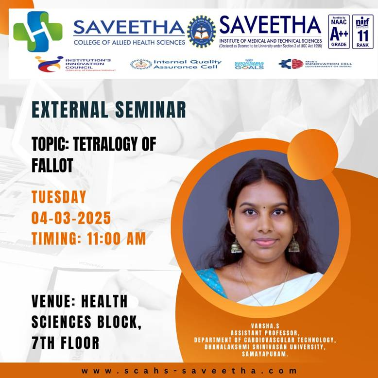 On March 4, 2025, SCAHS organized a seminar on the topic "Teratology of Fallot." The session was delivered by Varsha S., an Assistant Professor of Cardiovascular Technology at Dhanalakshmi Srinivasan University. The seminar provided an in-depth exploration of the congenital heart defect known as Tetralogy of Fallot, discussing its pathophysiology, clinical presentations, diagnostic approaches, and management strategies. Varsha S. shared her expertise and insights, offering attendees valuable knowledge on this complex condition, which is crucial for healthcare professionals working in the field of cardiovascular care.
