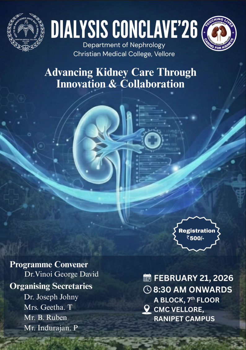 Mrs. Shobanaraj, Lecturer in Dialysis Technology at Saveetha College of Allied Health Sciences, participated as a Panel Discussant at Dialysis Conclave’26 organized by the Department of Nephrology, Christian Medical College, Vellore, on 21st February 2026. She spoke on the theme “Advancing Kidney Care Through Innovation and Collaboration.” She highlighted the importance of proper diet management in dialysis patients, prevention of protein-energy wasting, and practical strategies to improve patient care, including the use of diet applications. Her session was interactive and well received by the audience.