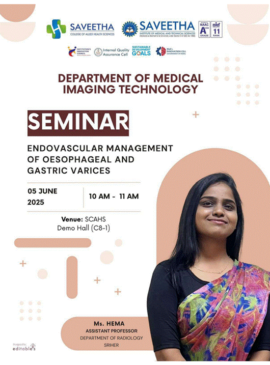 Saveetha College of Allied Health Sciences recently organized a seminar on the topic “Endovascular Management of Oesophageal and Gastric Varices”, conducted by the Department of Medical Imaging Technology on June 5, 2025, at the Demo Hall (C8-1). The session was delivered by Ms. Hema, Assistant Professor, Department of Radiology, SRIHER. The seminar aimed to enhance the understanding of students regarding advanced radiological and endovascular approaches used in the management of oesophageal and gastric varices. Ms. Hema provided valuable insights into the pathophysiology, diagnostic imaging techniques, and interventional procedures involved in treating variceal bleeding. She also discussed the significance of radiological interventions in improving patient outcomes and reducing complications. The interactive session included real-time case discussions, encouraging student participation and critical thinking. The event was highly informative and served as an excellent platform for bridging academic learning with clinical application in interventional radiology.