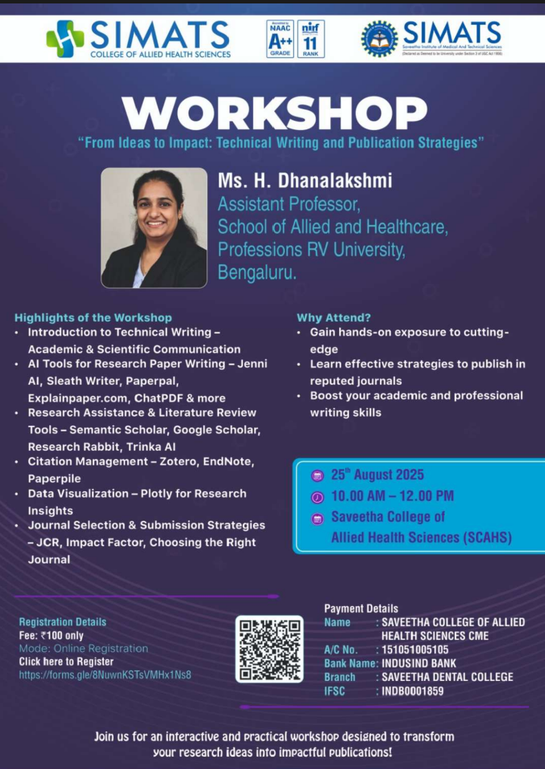 Saveetha College of Allied Health Sciences (SCAHS) conducted a workshop on 25/08/2025 titled “From Ideas to Impact: Technical Writing and Publication Strategies.” The workshop aimed to enhance PG and UG students’ skills in scientific writing, research presentation, and publication. Expert speakers provided practical insights into structuring manuscripts, selecting suitable journals, and understanding publication ethics. Participants engaged in interactive sessions, gaining hands-on experience in drafting abstracts, research articles, and review papers. The workshop emphasized the importance of effective communication of research findings to make a meaningful impact in academia and healthcare. It was well-received and encouraged participants to pursue quality publications.