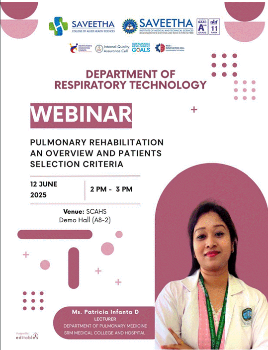 The Department of Respiratory Therapy at Saveetha College of Allied Health Sciences successfully organized a comprehensive webinar titled "Pulmonary Rehabilitation: An Overview and Patient Selection". The session was conducted by Ms. Patricia Infanta, a respected expert in respiratory care and rehabilitation. The webinar aimed to enhance the understanding of pulmonary rehabilitation among allied health professionals and students, emphasizing its growing importance in the management of chronic respiratory diseases. Ms. Patricia Infanta delivered an insightful presentation that covered the fundamental aspects of pulmonary rehabilitation, including its multidisciplinary approach, goals, and evidence-based outcomes. She detailed the selection criteria for patients who would benefit most from pulmonary rehab, touching upon clinical assessments, contraindications, and program customization.
