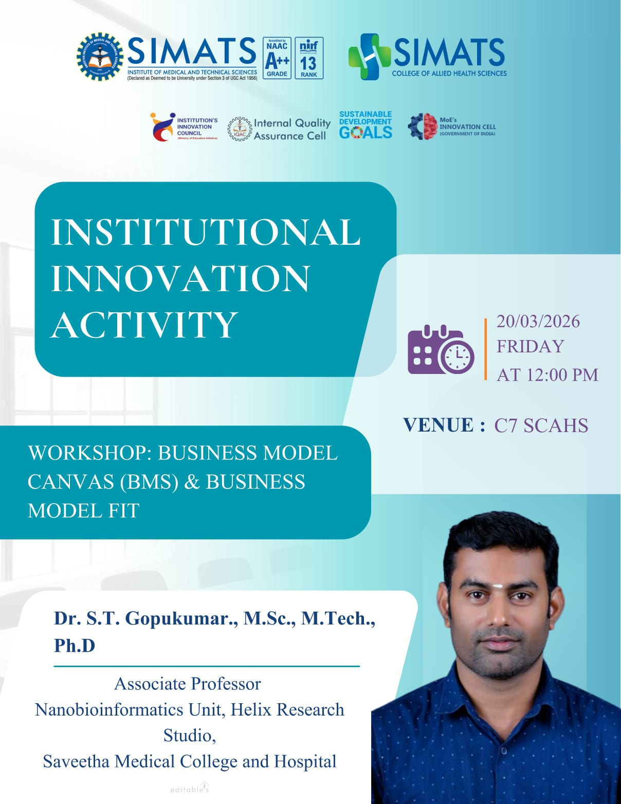 The Institutional Innovation Activity conducted on March 20, 2026, at SIMATS College of Allied Health Sciences focused on enhancing entrepreneurial skills among students. The workshop on Business Model Canvas (BMC) and Business Model Fit was delivered by Dr. S.T. Gopakumar, Associate Professor at the Nanobioinformatics and Helix Research Studio. The session emphasized strategic planning, value proposition, and sustainable business development. Held at C7 SCAHS, the program provided participants with practical insights into transforming innovative ideas into viable business models. It encouraged critical thinking, creativity, and application of theoretical knowledge in real-world scenarios, thereby promoting innovation-driven learning in healthcare and allied sciences.