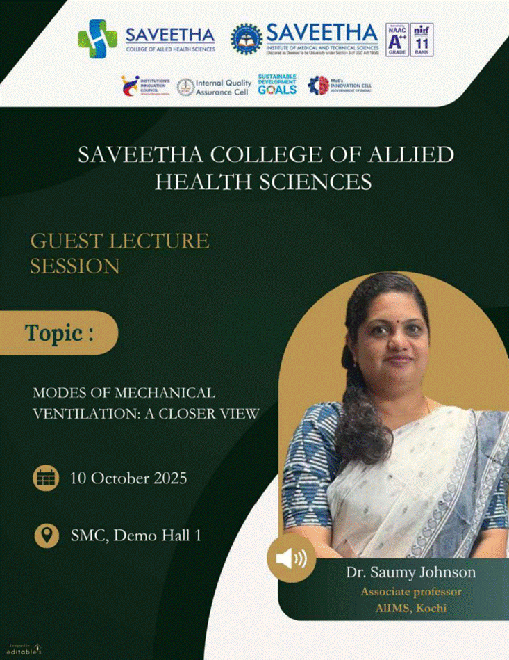 The Saveetha college of Allied Health Sciences (SCAHS) organized an enlightening guest lecture on 10th October 2025 on the topic “Modes of Mechanical Ventilation: A Closer View.” The session was delivered by Mrs. Saumy Johnson, Associate Professor, AIMS, Kochi. The lecture focused on the different modes of mechanical ventilation, their indications, and practical applications in clinical settings. Mrs. Saumy Johnson explained the physiological basis of each mode, the criteria for selection, and troubleshooting techniques for ventilator management. The interactive session encouraged participants to engage in discussions and clarify doubts related to patient care in critical care environments. Faculty members and students from the respiratory therapy and allied health departments actively participated and gained valuable knowledge about advanced ventilatory strategies. The event was highly informative and enhanced the understanding of mechanical ventilation, bridging the gap between theoretical concepts and clinical practice.