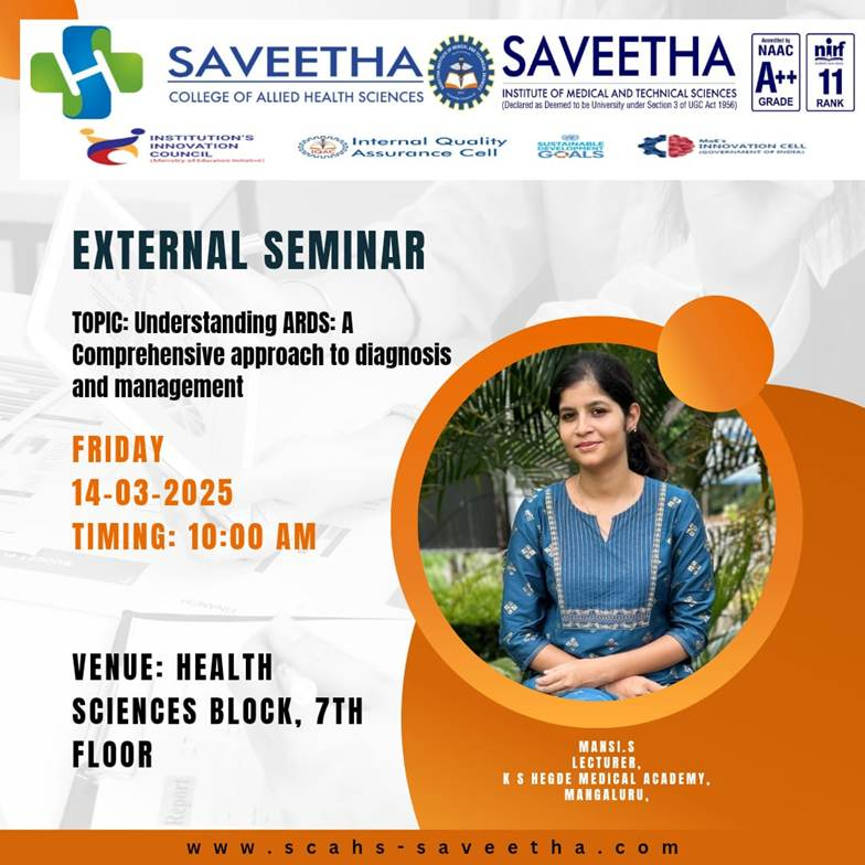 On March 14, 2025, Saveetha College of Allied Health Sciences (SCAHS) hosted an insightful seminar on a significant topic in the field of healthcare. The seminar was delivered by Mansi S, a respected Lecturer in Respiratory Therapy at K S Hegde Medical Academy, Mangaluru.Mansi S, with her extensive expertise in the field, led the session, providing valuable insights into various aspects of respiratory therapy. The seminar aimed to enhance the participants' understanding of respiratory care, including the latest techniques, technologies, and clinical practices essential for managing patients with respiratory conditions. Through her presentation, Mansi S highlighted the importance of advanced therapeutic strategies and the role of healthcare professionals in improving patient outcomes in respiratory therapy.