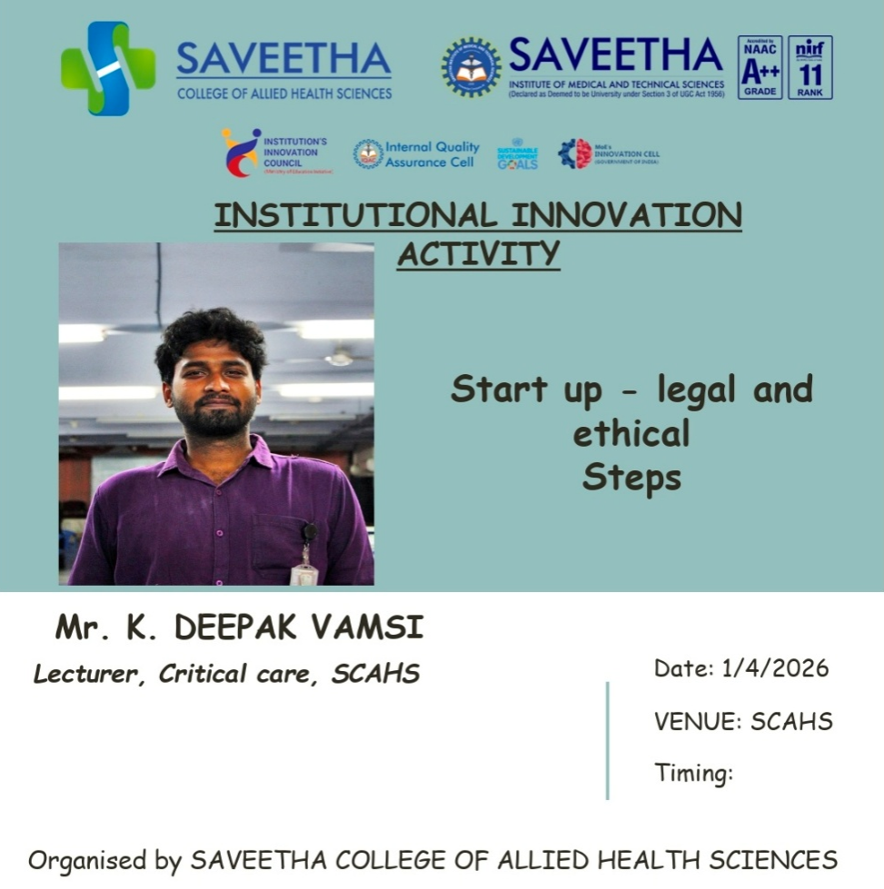 Saveetha College of Allied Health Sciences organized an Institutional Innovation Activity on 1st April 2026, focusing on “Start-up: Legal and Ethical Steps.” The session was led by Mr. K. Deepak Vamsi, Lecturer in Critical Care, who shared valuable insights into the foundational aspects of building a startup responsibly. The program highlighted essential legal frameworks, ethical considerations, and practical guidance for aspiring innovators. It encouraged students to think creatively while adhering to professional standards and regulations. The session served as an inspiring platform to promote innovation, entrepreneurship, and responsible decision-making among future healthcare professionals.