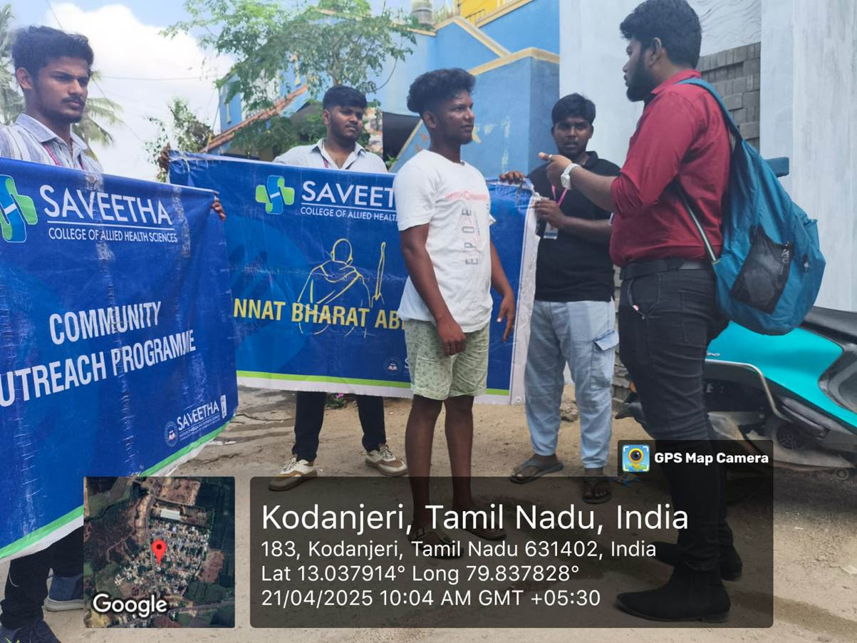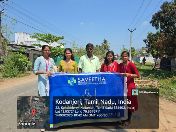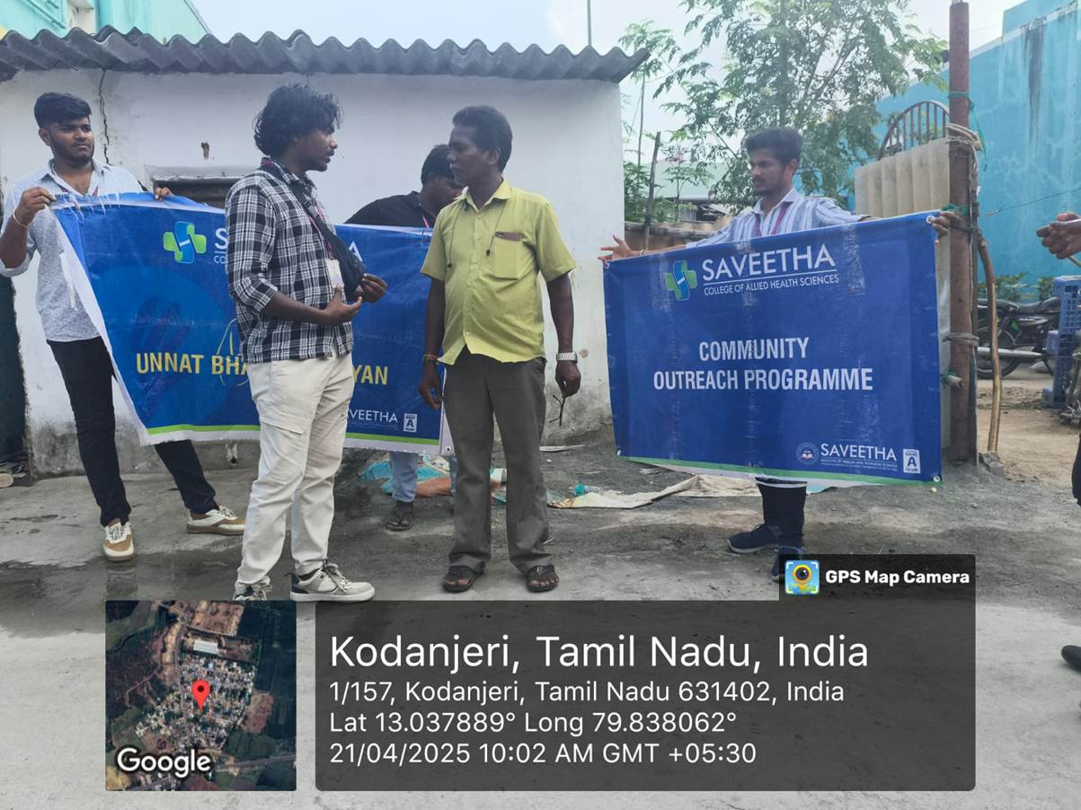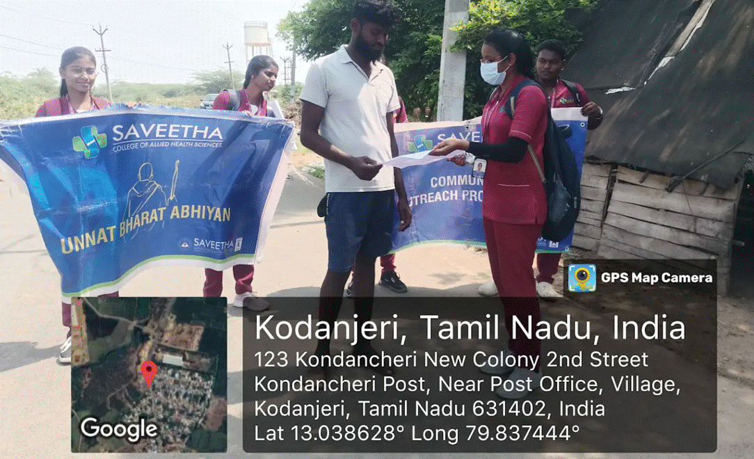 As a part of University's UBA (Unnat Bharat Abhiyan) the students of Saveetha College of Allied Health Sciences, organized an awareness camp at Kondanjeri Village to educate the community about stricture urethra, a condition where the urethra becomes narrowed due to scarring, leading to difficulty in urination. The main objective of the camp was to create awareness about the causes, symptoms, complications, and treatment options for this condition.