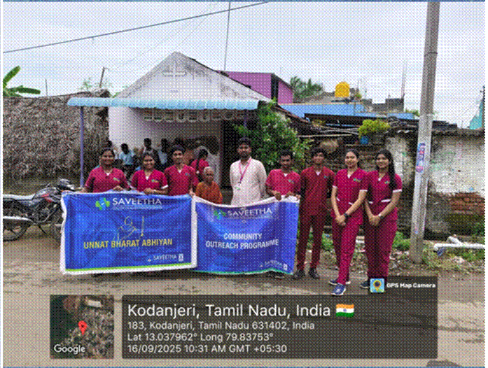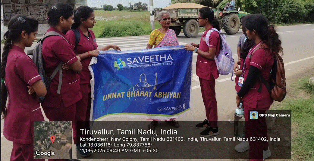 As part of the Unnat Bharat Abhiyan (UBA) and the community outreach program, students from Saveetha College of Allied Health Sciences visited Kondancherry village to conduct an awareness session on menopause. The objective of this initiative was to educate women in the community about the natural biological process of menopause, which is often misunderstood and surrounded by stigma. The students provided information on the common symptoms associated with menopause, such as hot flashes, mood swings, fatigue, sleep disturbances, and irregular menstrual cycles. They emphasized that menopause is not a disease but a natural transition that every woman experiences, usually between the ages of 45 and 55. The session also focused on lifestyle modifications, including a balanced diet, regular physical activity, and stress management techniques, to ease symptoms and improve overall well-being. Women were encouraged to seek medical advice when needed and share their experiences openly. The initiative fostered awareness, understanding, and emotional support within the community.