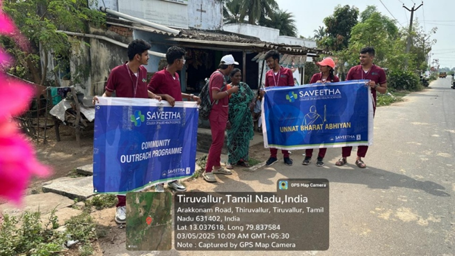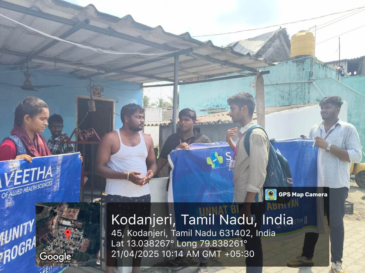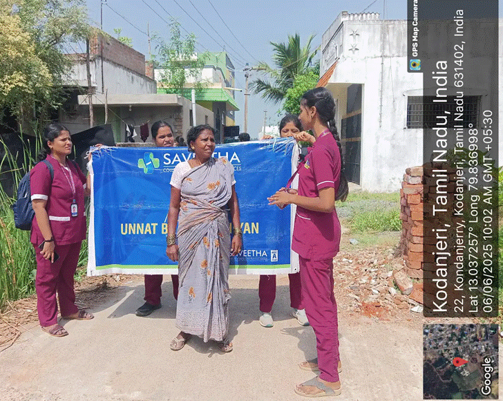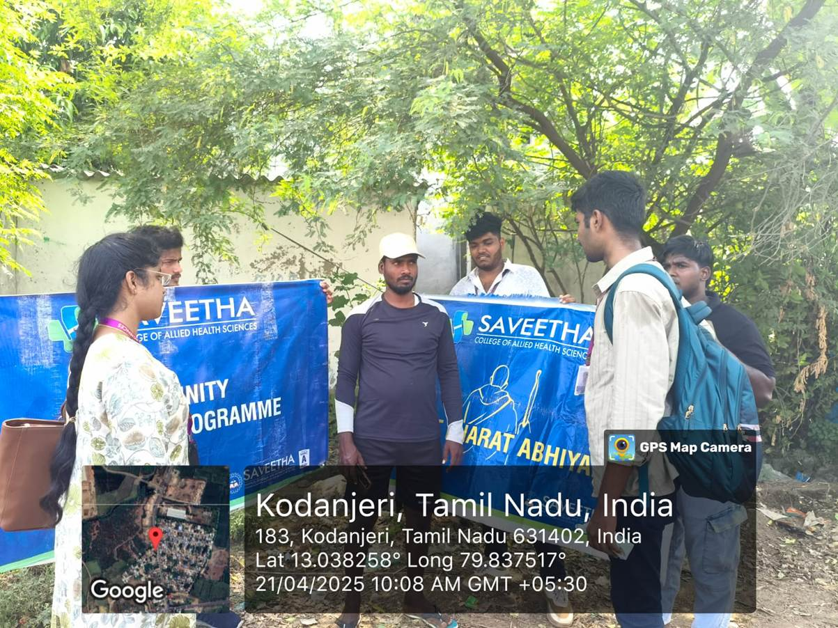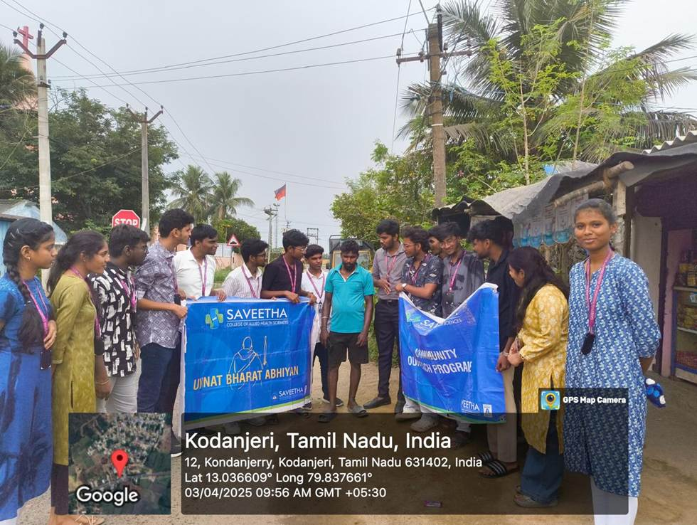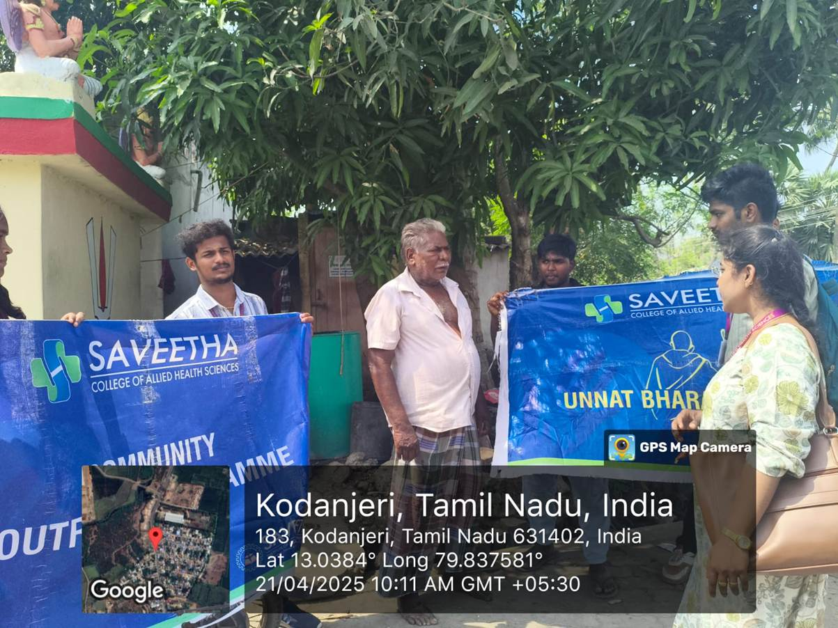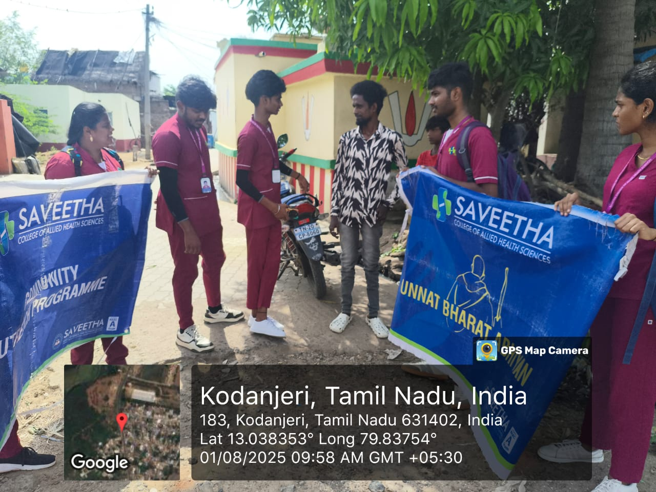 As part of the Unnat Bharat Abhiyan (UBA) and the community outreach program, students from Saveetha College of Allied Health Sciences visited Kondancherry village to raise awareness about malaria, a serious infectious disease transmitted through the bite of infected mosquitoes. The aim of the initiative was to educate the villagers on the causes, symptoms, prevention, and treatment of malaria, which is a significant health concern in many rural areas. During the session, the students explained that malaria is caused by Plasmodium parasites, which are spread to humans through the bites of infected female Anopheles mosquitoes. They highlighted common symptoms such as fever, chills, headaches, and fatigue. Emphasis was placed on the importance of preventing mosquito bites by using mosquito nets, applying repellents, and clearing stagnant water where mosquitoes breed. The students also discussed the importance of seeking medical help immediately if symptoms appear, as early diagnosis and treatment are crucial for preventing complications. The villagers actively participated in the discussion, gaining a better understanding of how to protect themselves from malaria.