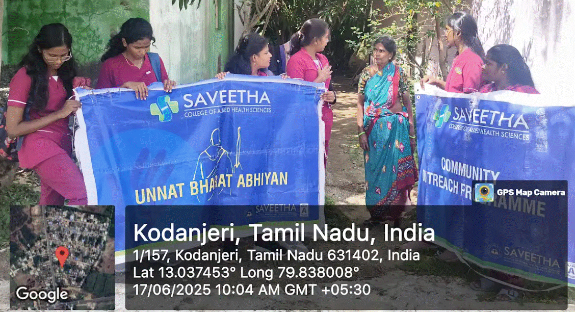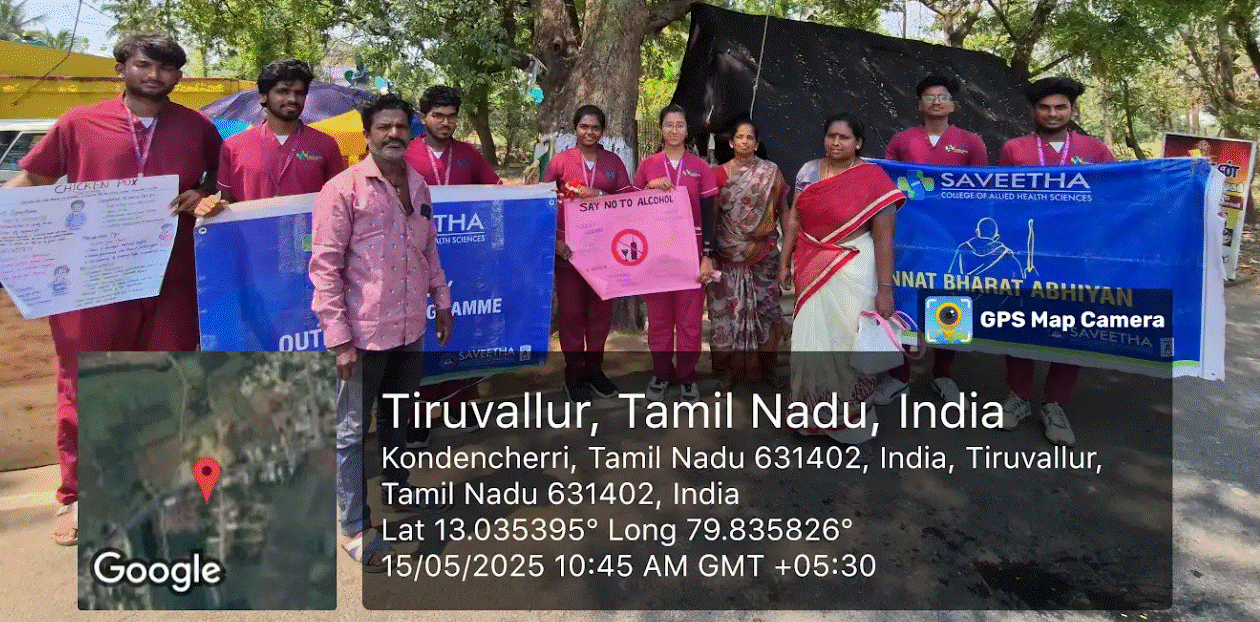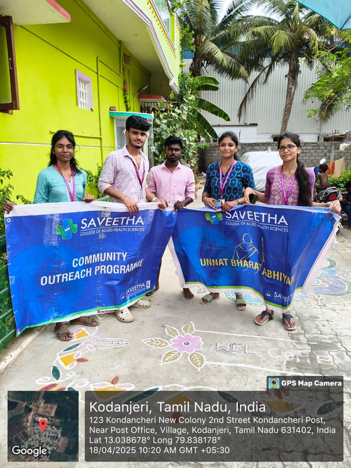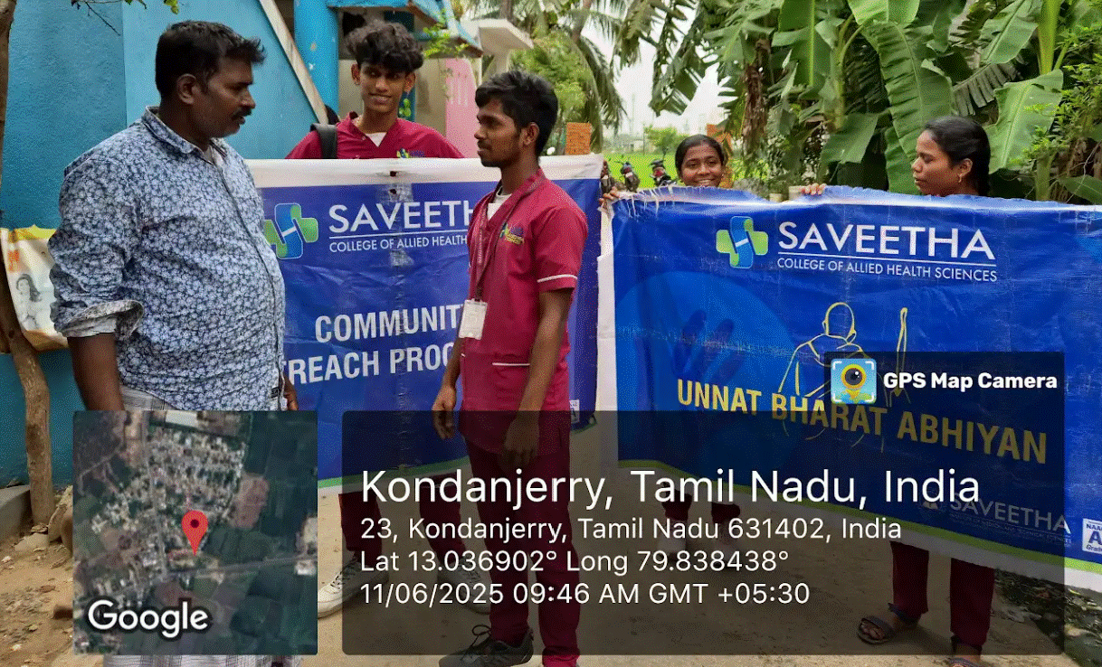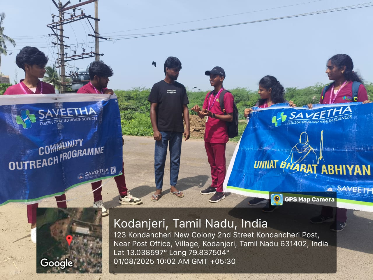 As part of the Unnat Bharat Abhiyan (UBA) and the community outreach initiative, students from Saveetha College of Allied Health Sciences visited Kondancherry village to conduct an awareness program on sources of infection and their prevention. The campaign aimed to educate the local residents about common sources of infections in rural settings, including contaminated water, poor sanitation, lack of personal hygiene, and improper waste disposal. The students engaged the community through interactive sessions, posters, and demonstrations to highlight how everyday practices can contribute to the spread of infectious diseases. They explained the importance of hand hygiene, safe food and water consumption, use of toilets, and vector control measures to minimize the risk of infections. Special attention was given to preventing waterborne and airborne diseases, as well as infections transmitted through contact. The villagers responded with enthusiasm, actively participating and expressing interest in adopting healthier practices. The initiative helped promote preventive healthcare and community hygiene.