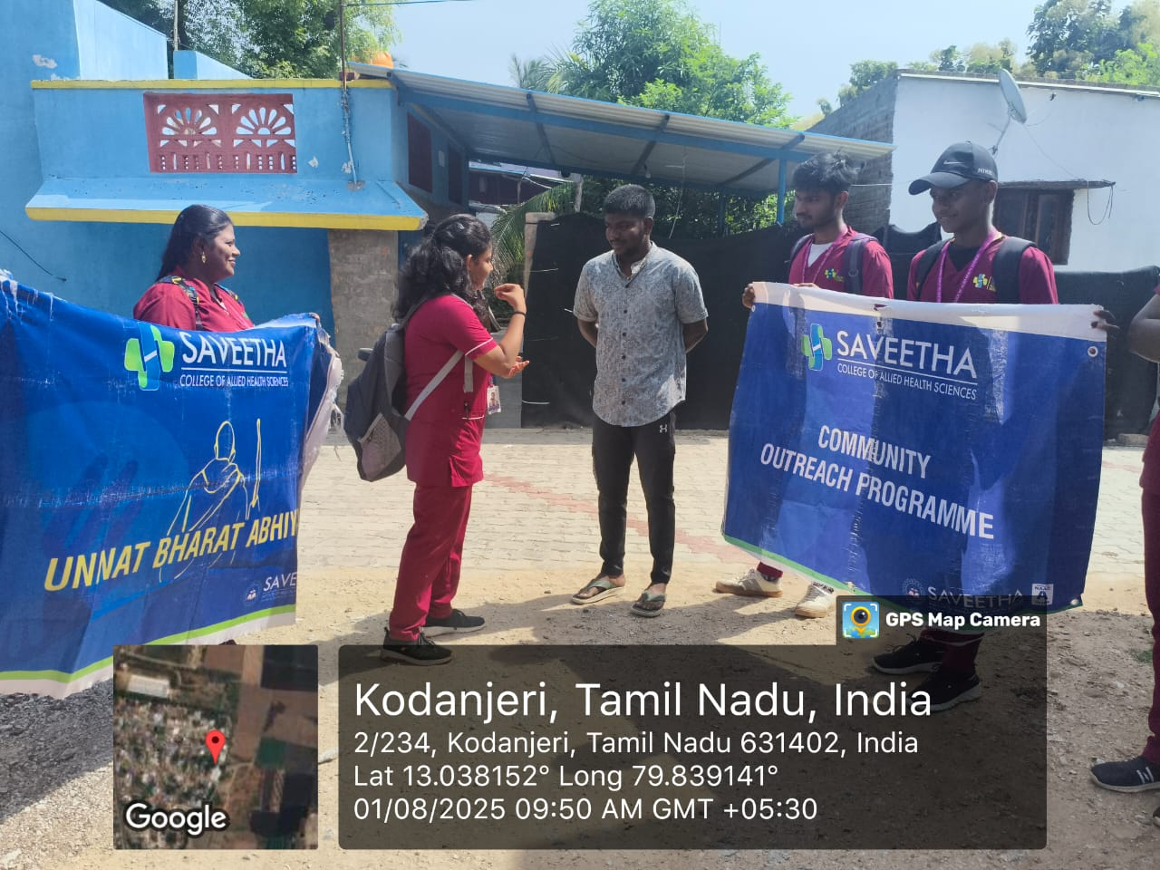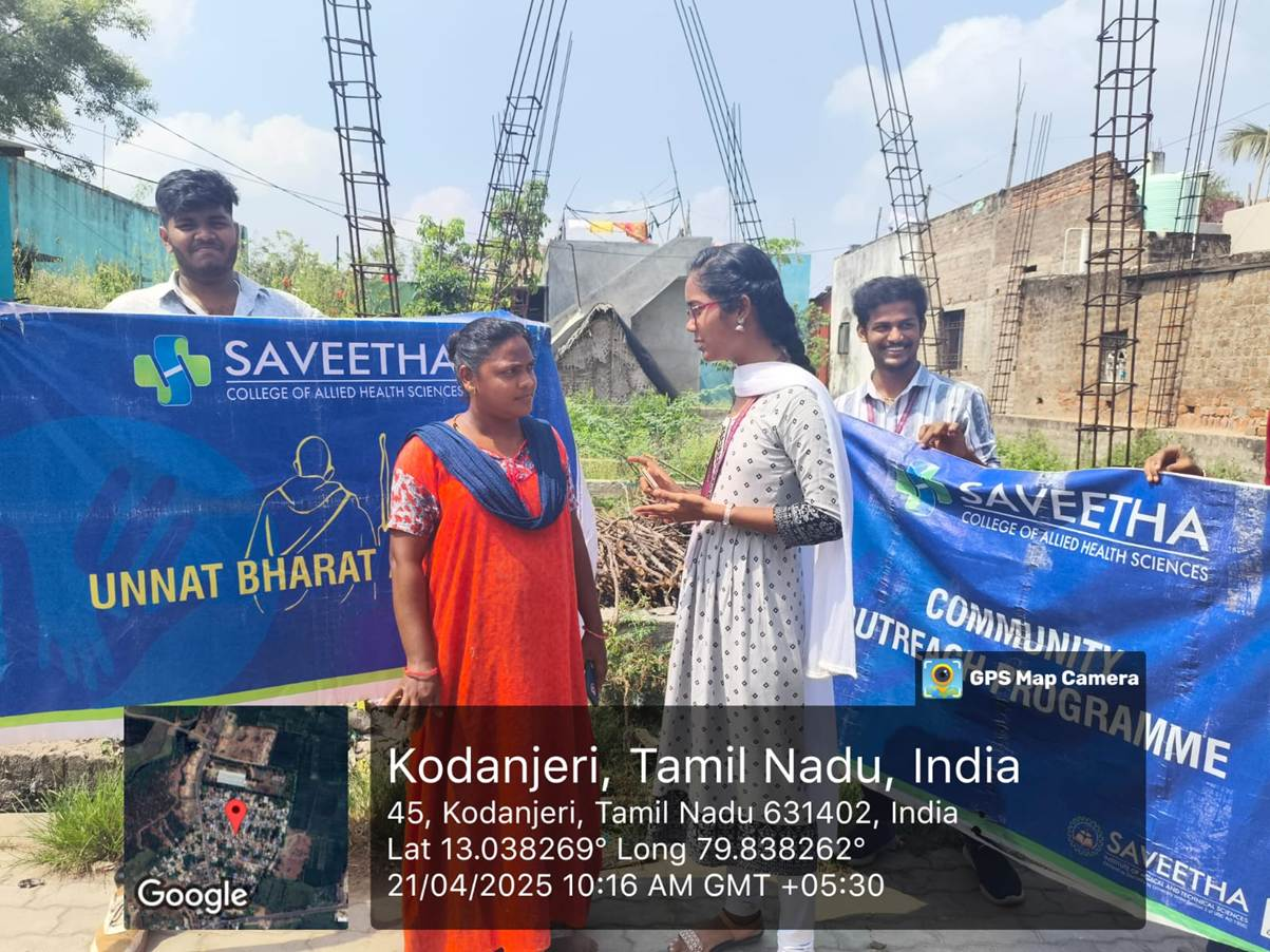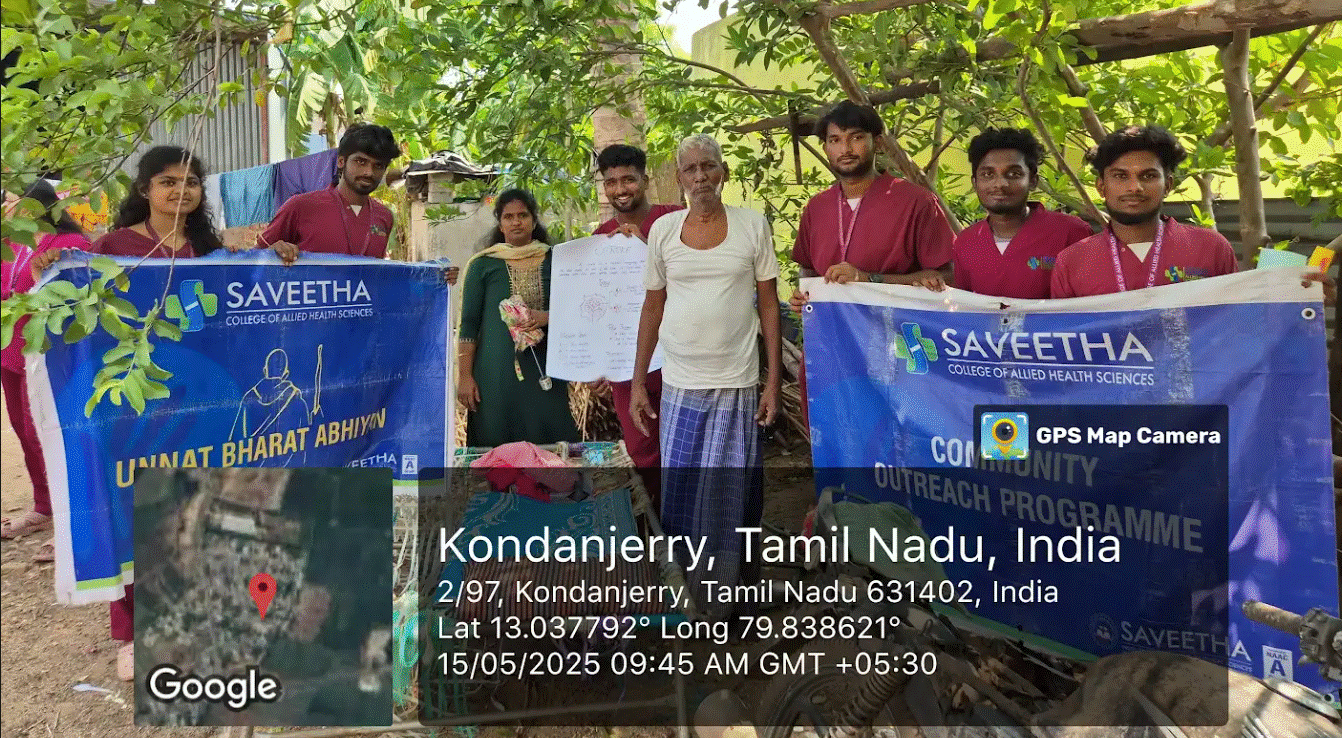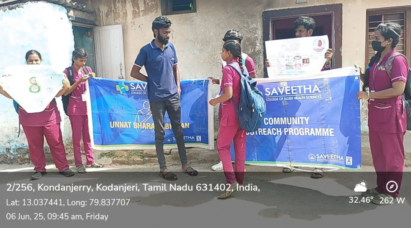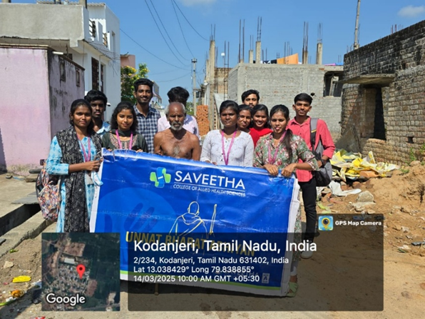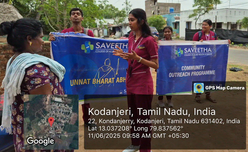 As part of the Unnat Bharat Abhiyan (UBA) and the community outreach initiative, students from Saveetha College of Allied Health Sciences visited Kondancherry village to conduct an awareness program on sources of infection and their prevention. The campaign aimed to educate the local residents about common sources of infections in rural settings, including contaminated water, poor sanitation, lack of personal hygiene, and improper waste disposal. The students engaged the community through interactive sessions, posters, and demonstrations to highlight how everyday practices can contribute to the spread of infectious diseases. They explained the importance of hand hygiene, safe food and water consumption, use of toilets, and vector control measures to minimize the risk of infections. Special attention was given to preventing waterborne and airborne diseases, as well as infections transmitted through contact. The villagers responded with enthusiasm, actively participating and expressing interest in adopting healthier practices. The initiative helped promote preventive healthcare and community hygiene.