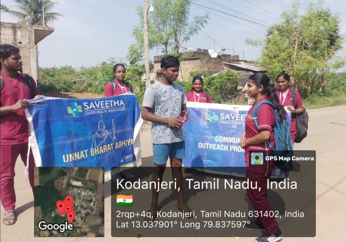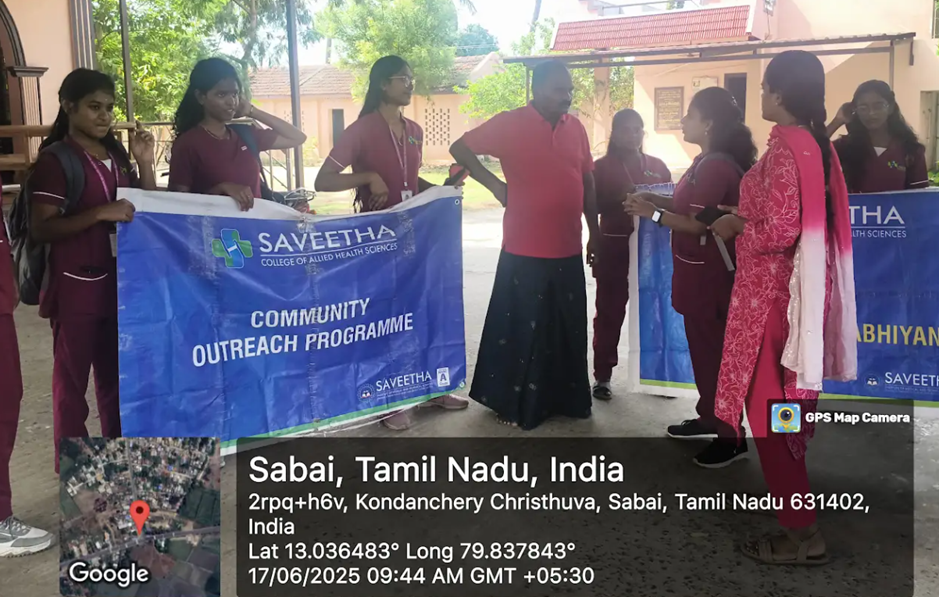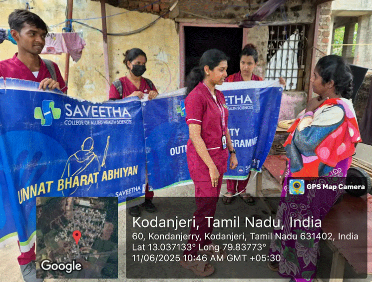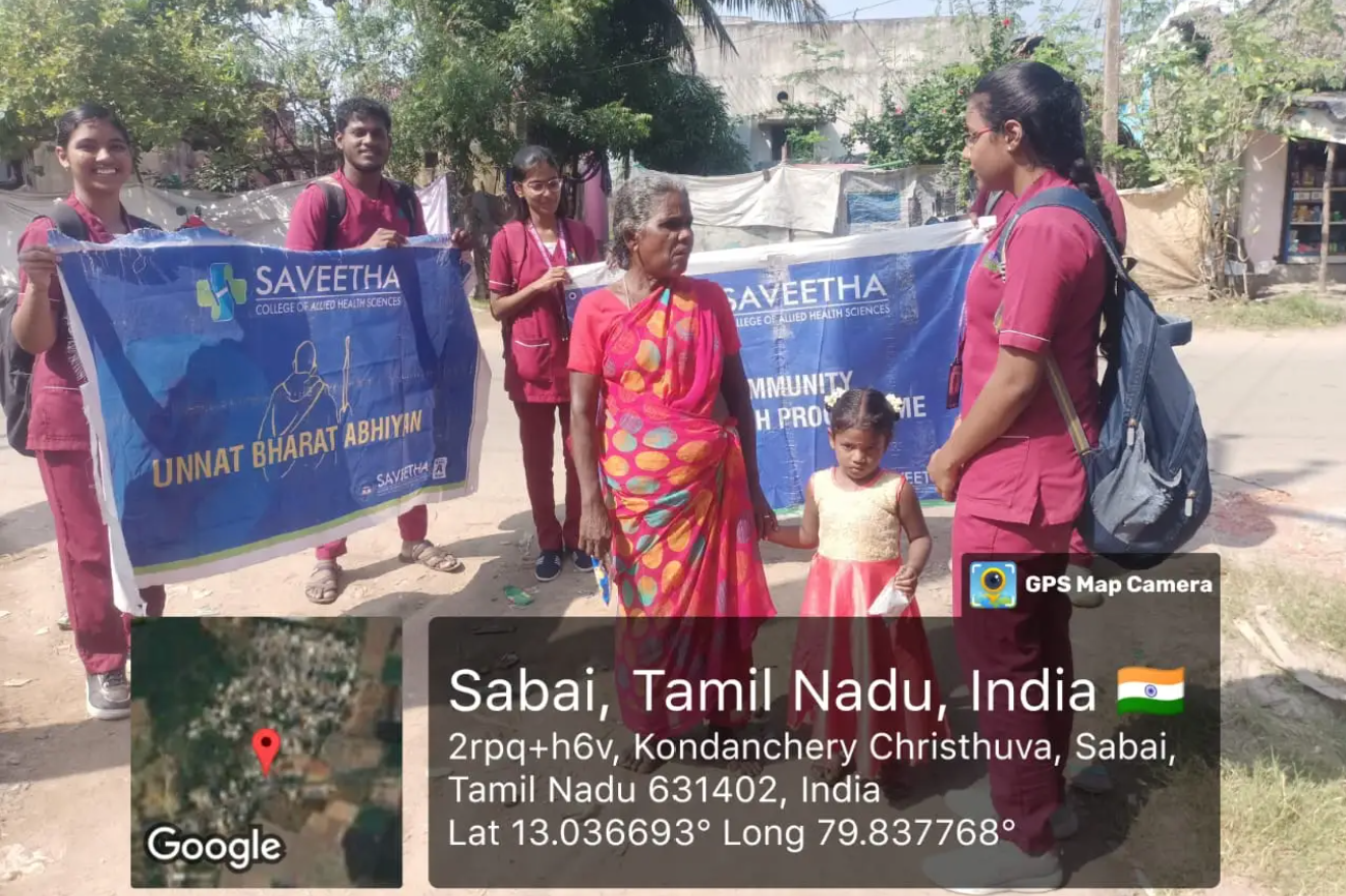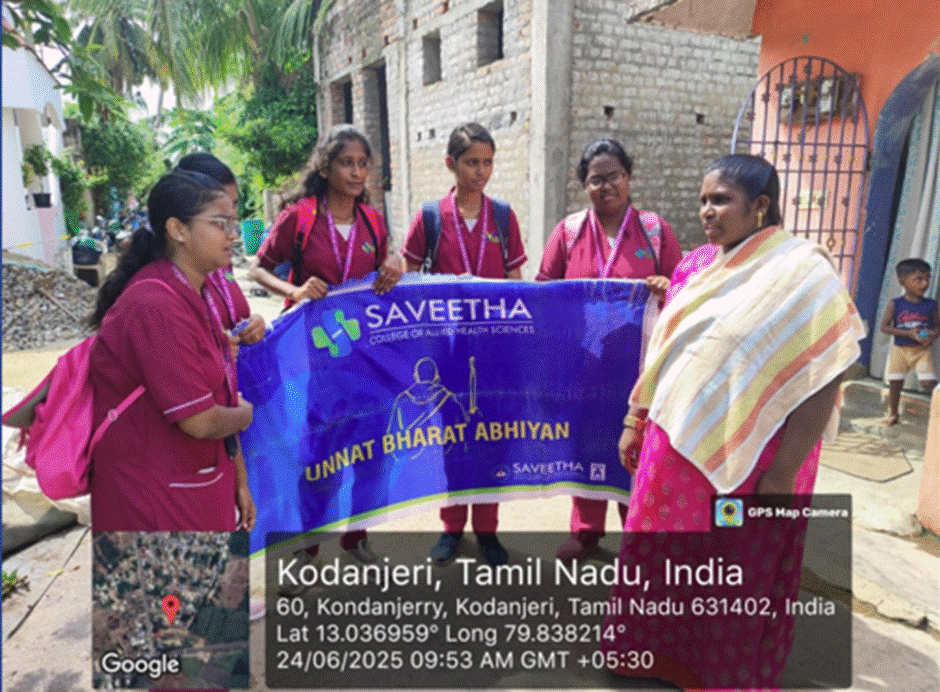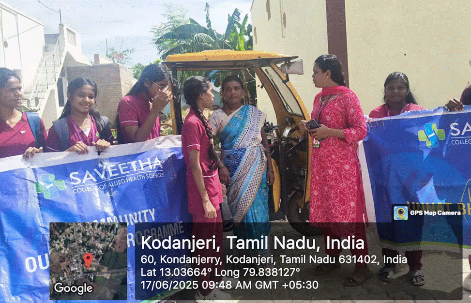 As part of the Unnat Bharat Abhiyan (UBA) and the community outreach initiative, students from Saveetha College of Allied Health Sciences visited Kondancherry village to conduct an awareness program on sources of infection and their prevention. The campaign aimed to educate the local residents about common sources of infections in rural settings, including contaminated water, poor sanitation, lack of personal hygiene, and improper waste disposal. The students engaged the community through interactive sessions, posters, and demonstrations to highlight how everyday practices can contribute to the spread of infectious diseases. They explained the importance of hand hygiene, safe food and water consumption, use of toilets, and vector control measures to minimize the risk of infections. Special attention was given to preventing waterborne and airborne diseases, as well as infections transmitted through contact. The villagers responded with enthusiasm, actively participating and expressing interest in adopting healthier practices. The initiative helped promote preventive healthcare and community hygiene.
