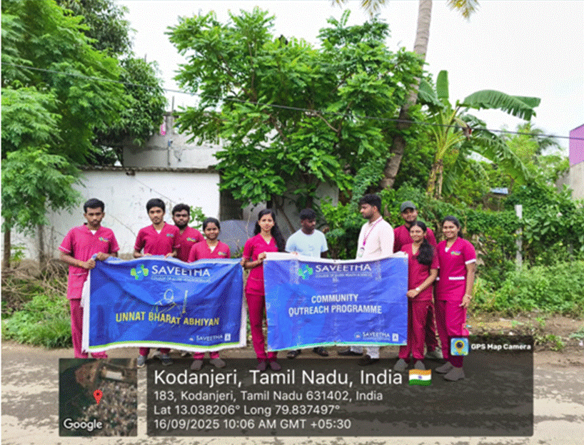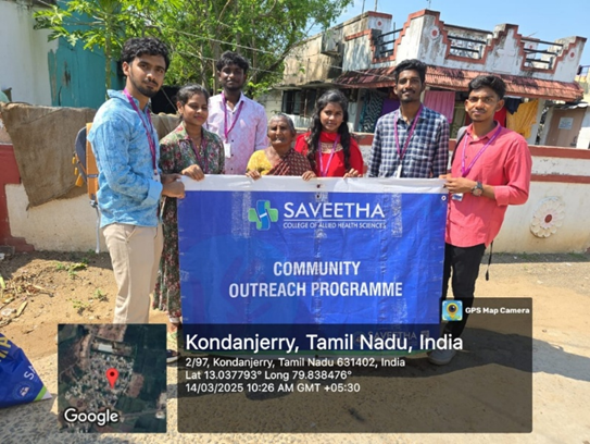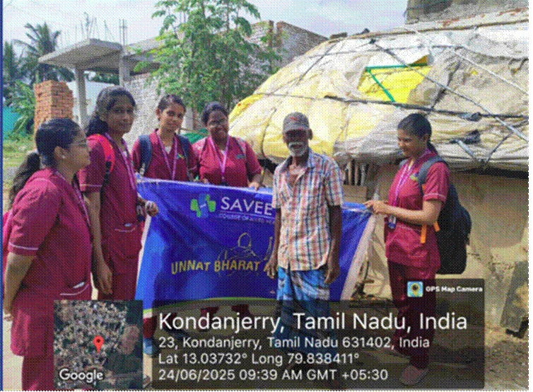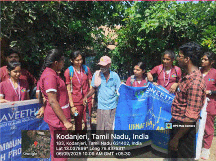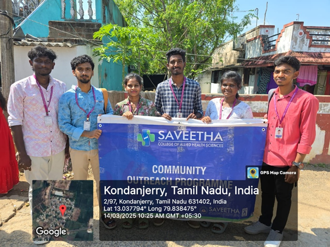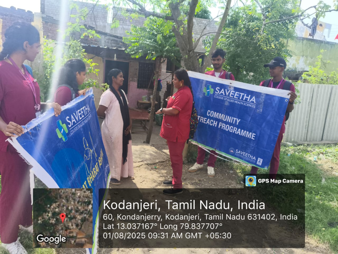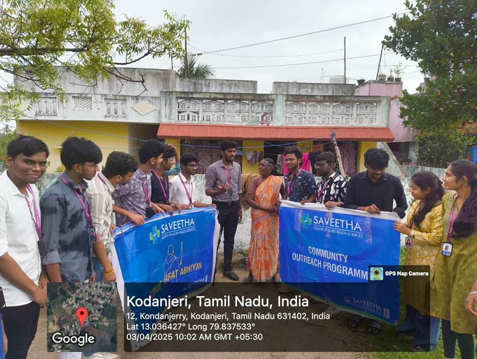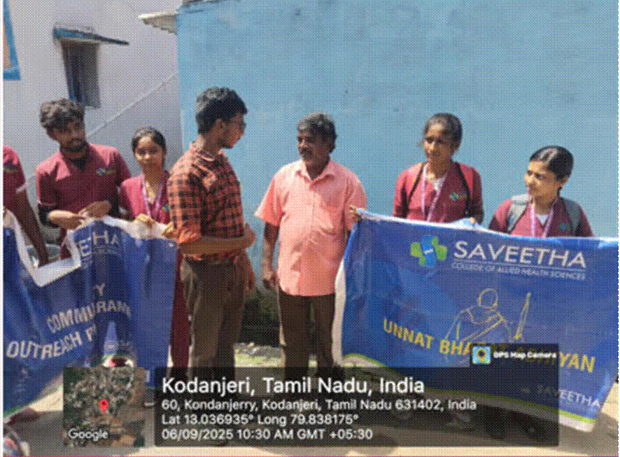 As part of the Unnat Bharat Abhiyan (UBA) and the community outreach initiative, students from Saveetha College of Allied Health Sciences visited Kondancherry village to conduct an awareness program on sources of infection and their prevention. The campaign aimed to educate the local residents about common sources of infections in rural settings, including contaminated water, poor sanitation, lack of personal hygiene, and improper waste disposal. The students engaged the community through interactive sessions, posters, and demonstrations to highlight how everyday practices can contribute to the spread of infectious diseases. They explained the importance of hand hygiene, safe food and water consumption, use of toilets, and vector control measures to minimize the risk of infections. Special attention was given to preventing waterborne and airborne diseases, as well as infections transmitted through contact. The villagers responded with enthusiasm, actively participating and expressing interest in adopting healthier practices. The initiative helped promote preventive healthcare and community hygiene.