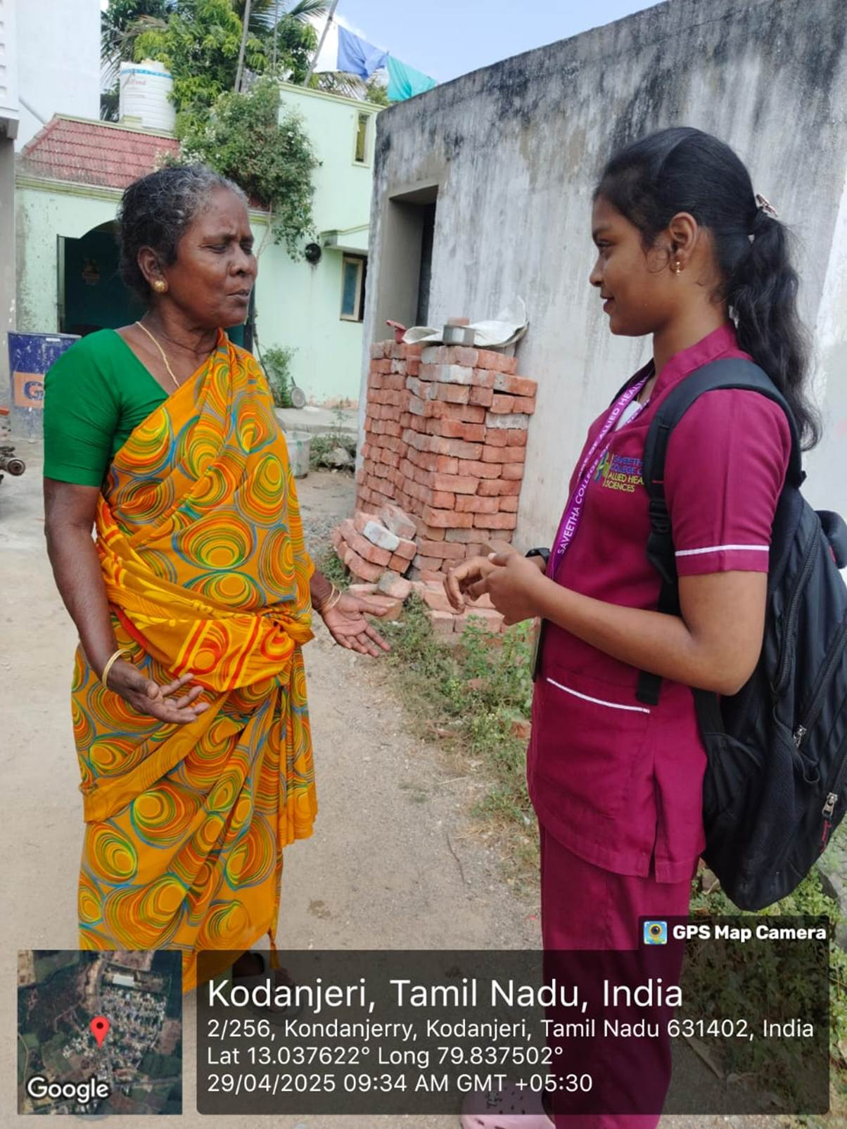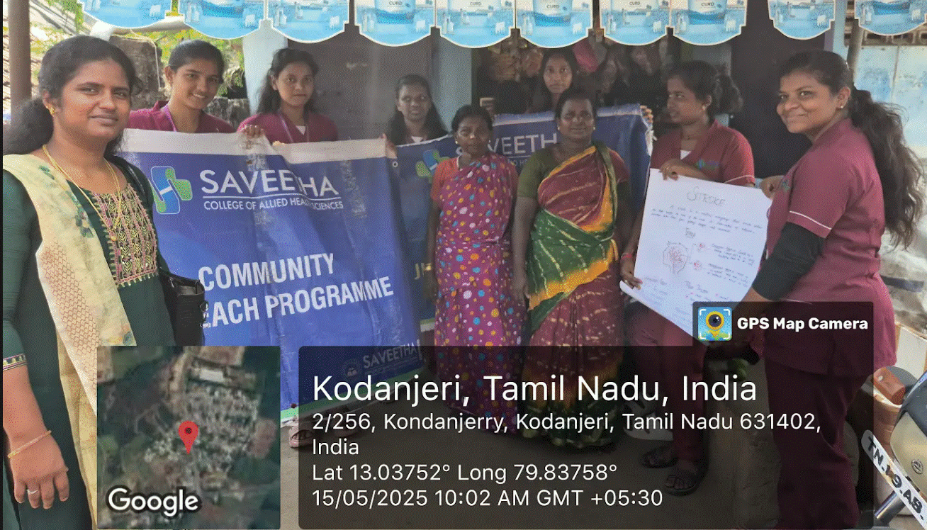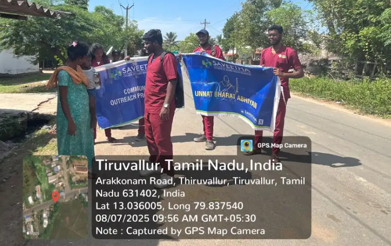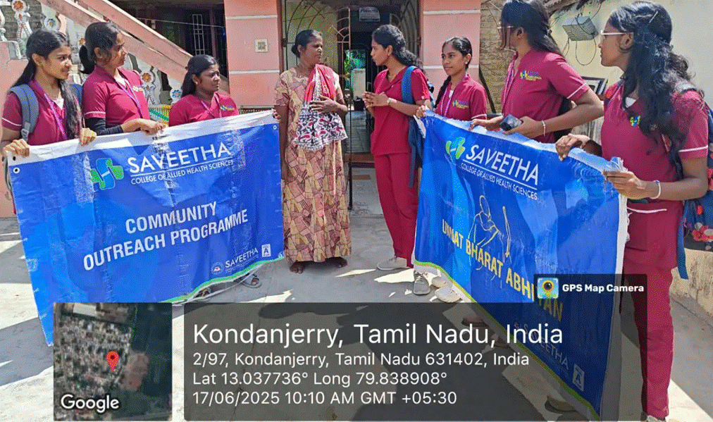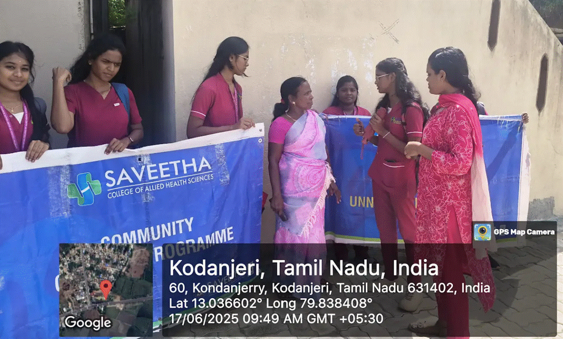 As part of the Unnat Bharat Abhiyan (UBA) and the community outreach initiative, students from Saveetha College of Allied Health Sciences visited Kondancherry village to raise awareness about heat stroke, a serious and potentially life-threatening condition, especially during the peak summer months. The aim of the campaign was to educate villagers on recognizing the signs, symptoms, and preventive measures for heat stroke, which is often caused by prolonged exposure to high temperatures and dehydration. Students explained key symptoms such as high body temperature, dizziness, nausea, confusion, dry skin, and rapid heartbeat. They emphasized the importance of staying hydrated, wearing light and breathable clothing, avoiding strenuous outdoor activities during peak sunlight hours, and seeking shade or cool environments. Practical first-aid steps were also demonstrated to manage heat stroke in emergency situations. The session was well-received by the community, empowering residents with knowledge to protect themselves and others from heat-related illnesses.