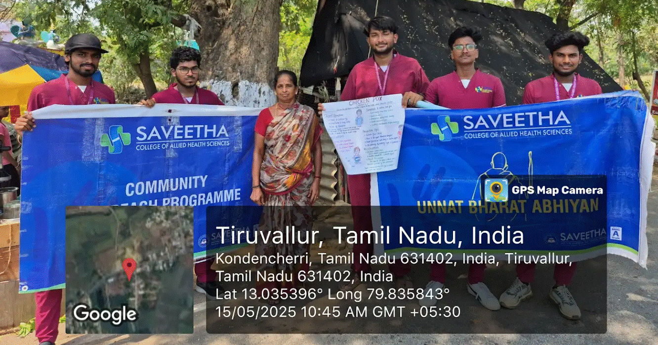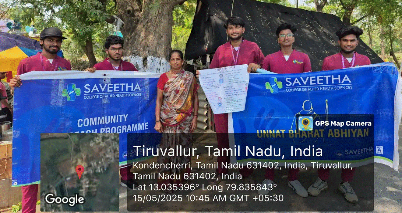 As part of the Unnat Bharat Abhiyan (UBA) and the community outreach program, students from Saveetha College of Allied Health Sciences visited Kondancherry village to raise awareness about chickenpox, a contagious viral infection that is common, especially in children. The aim of the initiative was to educate the villagers about the causes, symptoms, prevention, and management of chickenpox. During the session, the students explained that chickenpox is caused by the varicella-zoster virus and spreads through direct contact with infected individuals or through airborne droplets. They discussed the common symptoms, including an itchy rash, fever, and general fatigue, and emphasized the importance of early diagnosis to prevent complications. The students also focused on preventive measures, such as vaccination, avoiding contact with infected individuals, and maintaining good hygiene practices. Additionally, the villagers were encouraged to seek medical care if symptoms worsen. The interactive session helped empower the community with knowledge to prevent the spread of chickenpox and ensure better health practices.