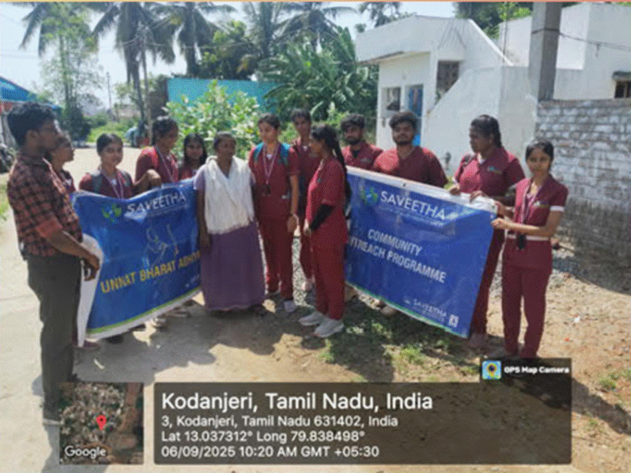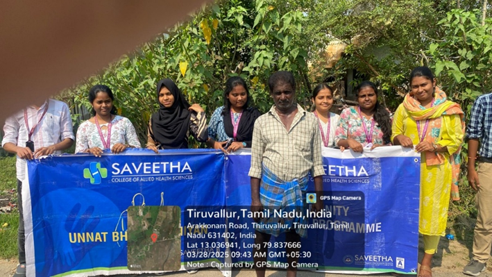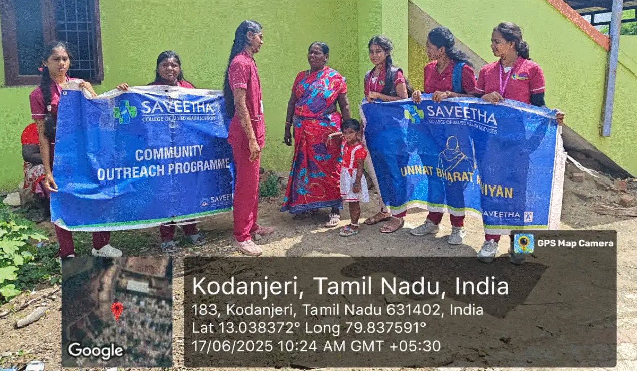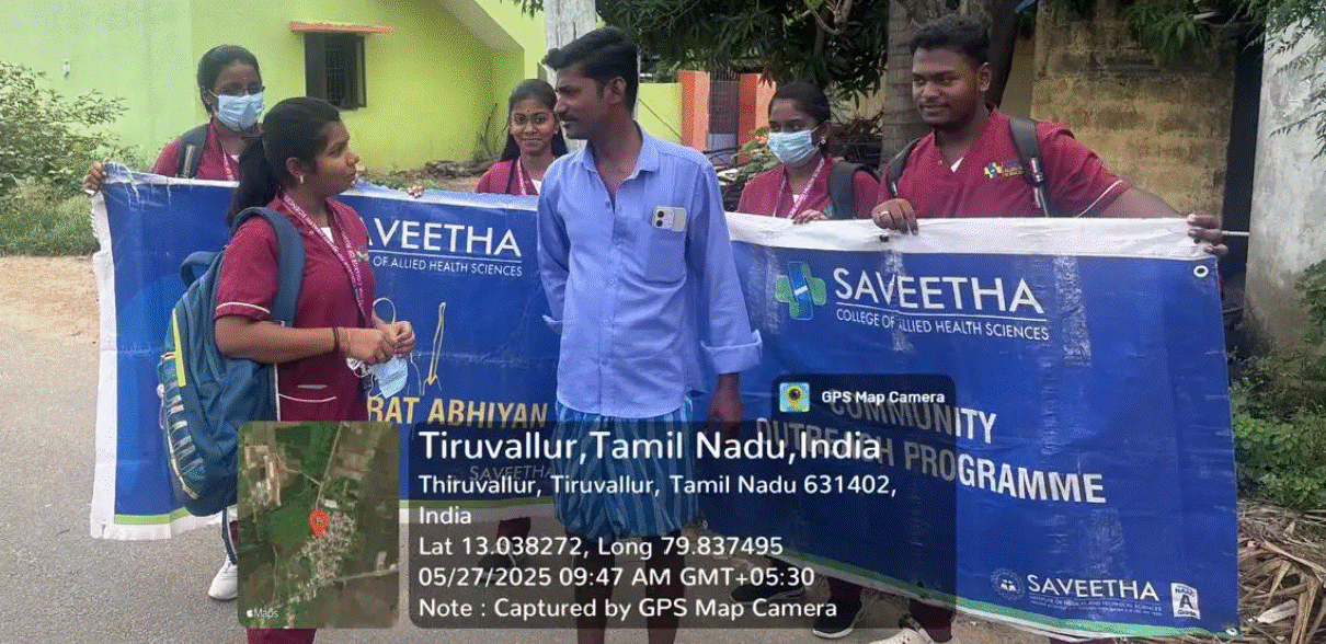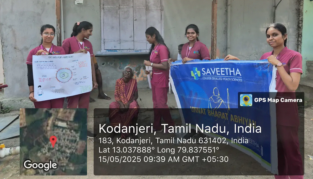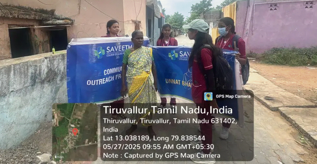 Under the Unnat Bharat Abhiyan (UBA) initiative and the community outreach program of Saveetha College of Allied Health Sciences (SCAHS), students visited the village to conduct an Awareness Program on Asthma and Basic Do’s and Don’ts. The session focused on helping the community understand asthma triggers such as dust, smoke, cold air, strong perfumes, and infections. Students educated participants on essential do’s—such as using prescribed inhalers, keeping homes dust-free, and practicing breathing exercises. They also highlighted important don’ts, including avoiding smoking, not skipping medications, and staying away from known triggers. Guidance on handling an asthma attack was provided, emphasizing calm breathing and proper use of the reliever inhaler. The program helped villagers gain confidence in managing asthma and preventing emergency situations