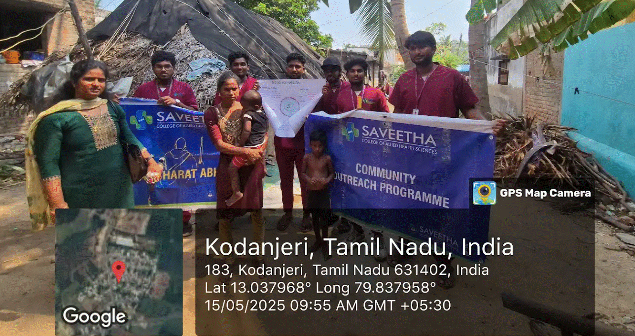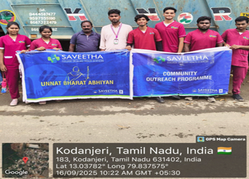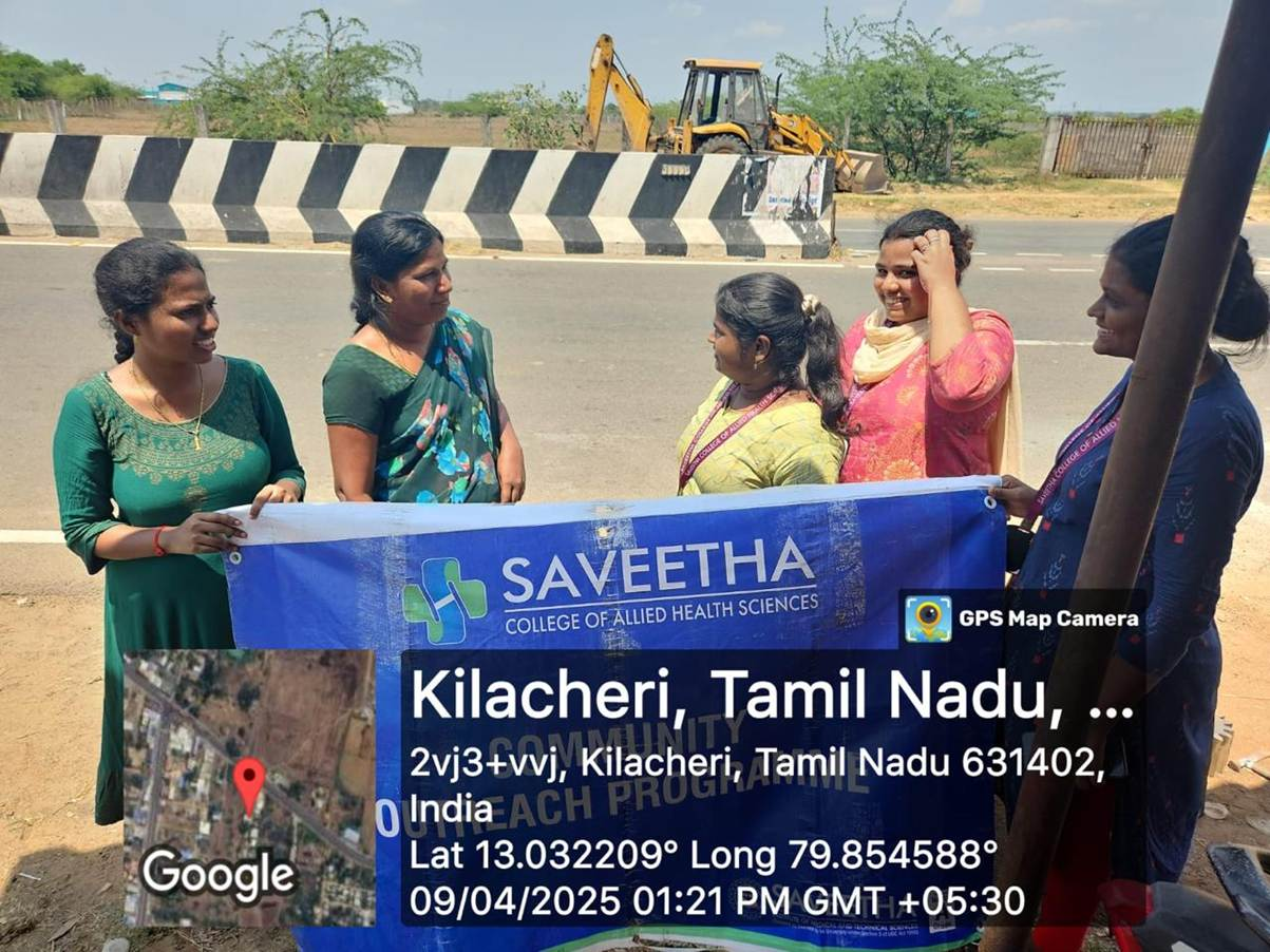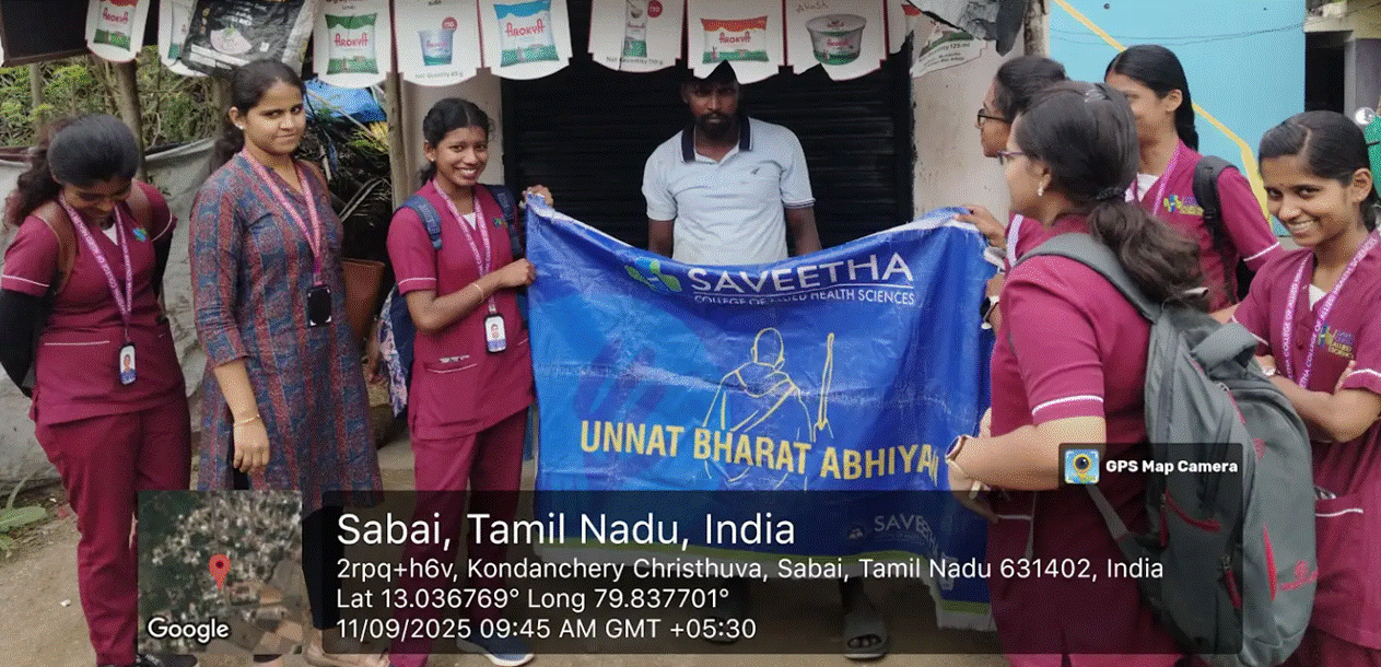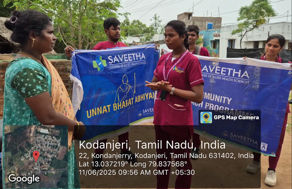 As part of the Unnat Bharat Abhiyan (UBA) initiative and the community outreach efforts of Saveetha College of Allied Health Sciences (SCAHS), students visited the village to conduct an Awareness Program on the Importance of Handwashing. The session focused on educating the community about how regular handwashing with soap can prevent the spread of common infections such as diarrhea, typhoid, flu, and COVID-19. Students demonstrated the correct 7-step handwashing technique and emphasized key moments for hand hygiene, including before eating, after using the toilet, and after coughing or touching contaminated surfaces. The team also explained how proper handwashing protects children, elderly individuals, and the entire family by breaking the chain of infection. The program aimed to promote healthier hygiene habits and reduce preventable diseases in the community.