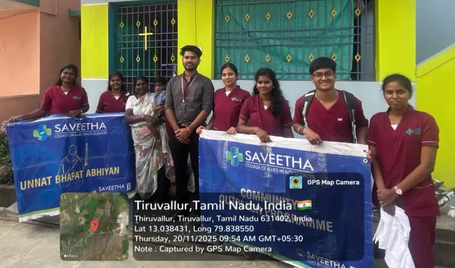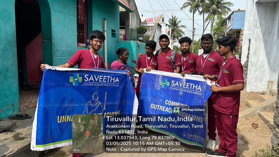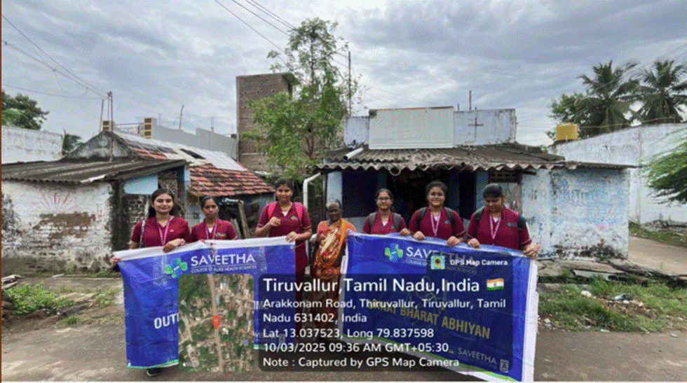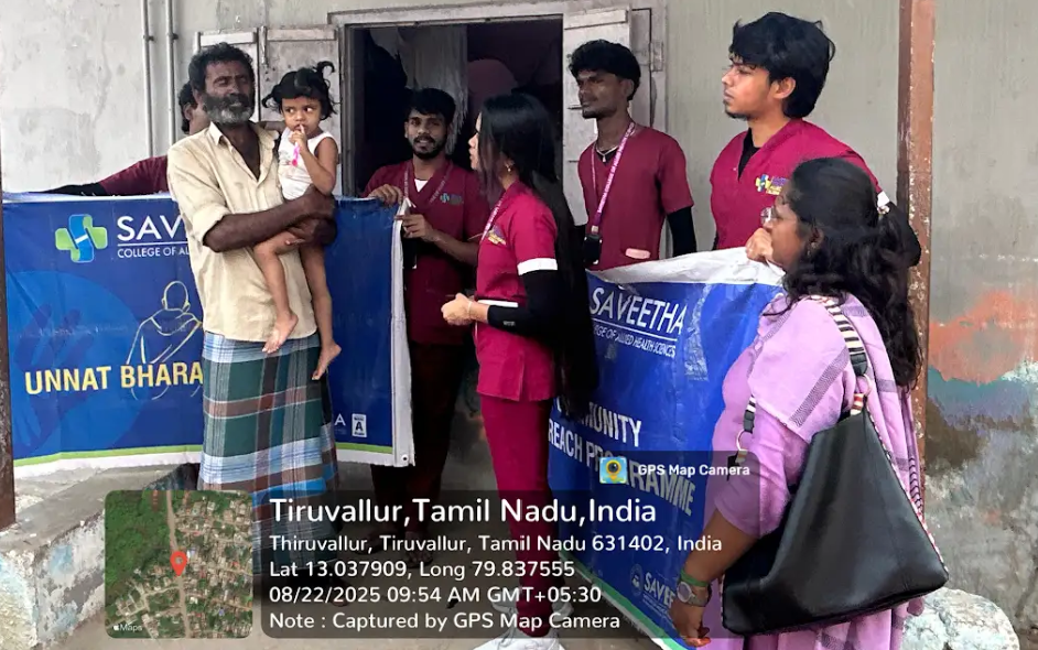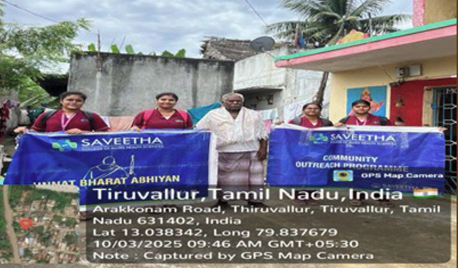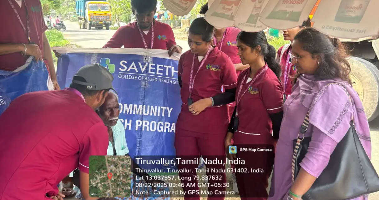 As part of the Unnat Bharat Abhiyan (UBA) initiative and the community outreach efforts of Saveetha College of Allied Health Sciences (SCAHS), students visited the village to conduct an Awareness Program on the Importance of Handwashing. The session focused on educating the community about how regular handwashing with soap can prevent the spread of common infections such as diarrhea, typhoid, flu, and COVID-19. Students demonstrated the correct 7-step handwashing technique and emphasized key moments for hand hygiene, including before eating, after using the toilet, and after coughing or touching contaminated surfaces. The team also explained how proper handwashing protects children, elderly individuals, and the entire family by breaking the chain of infection. The program aimed to promote healthier hygiene habits and reduce preventable diseases in the community.
