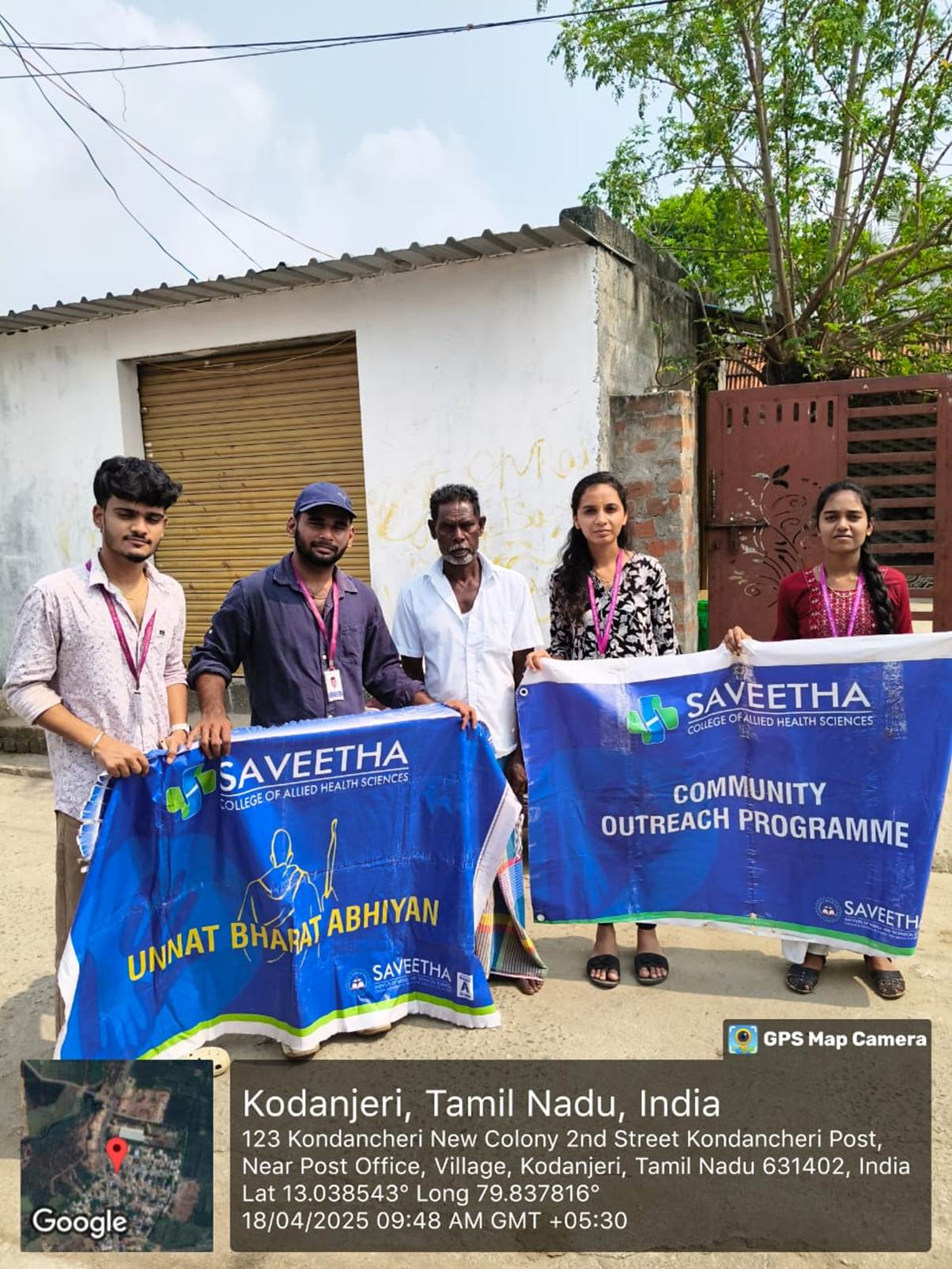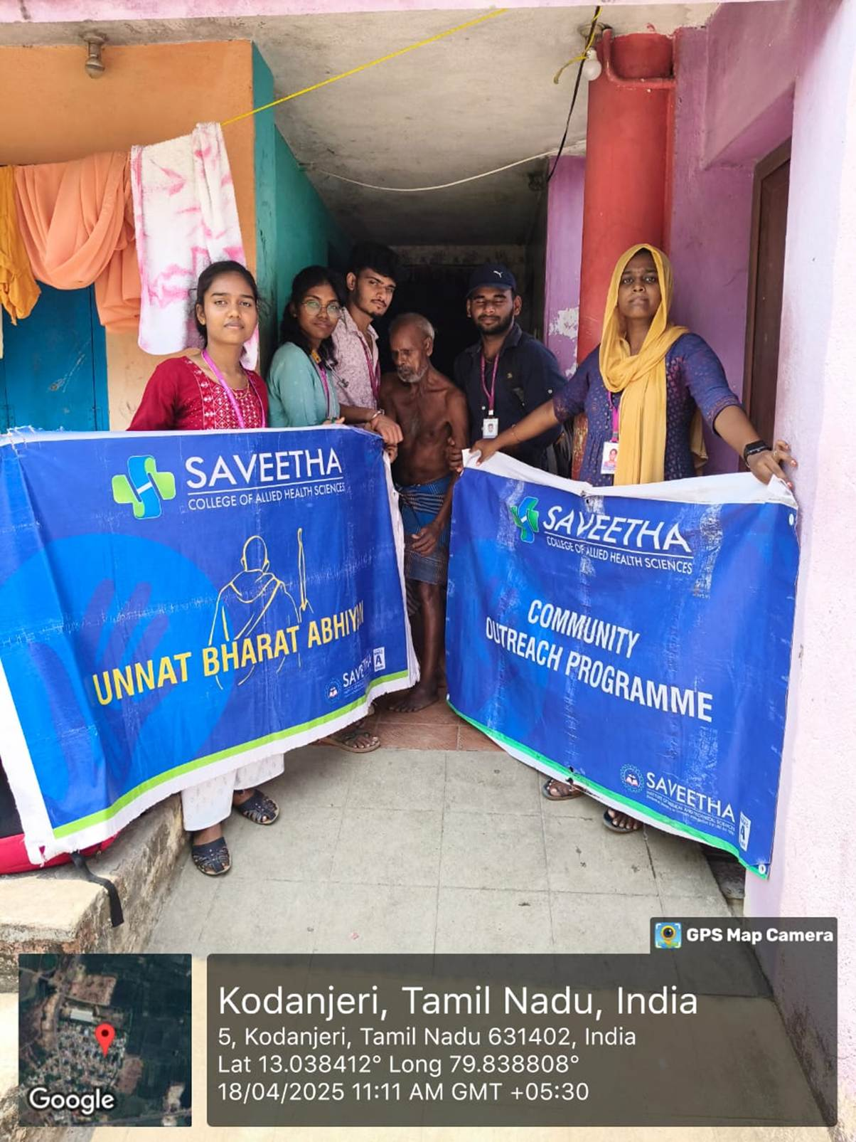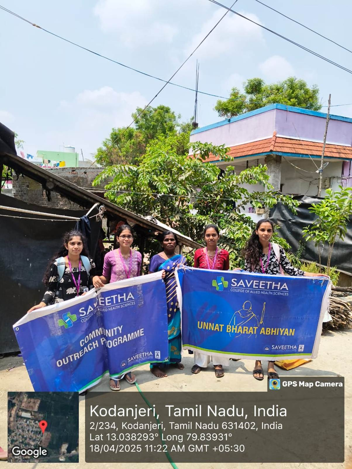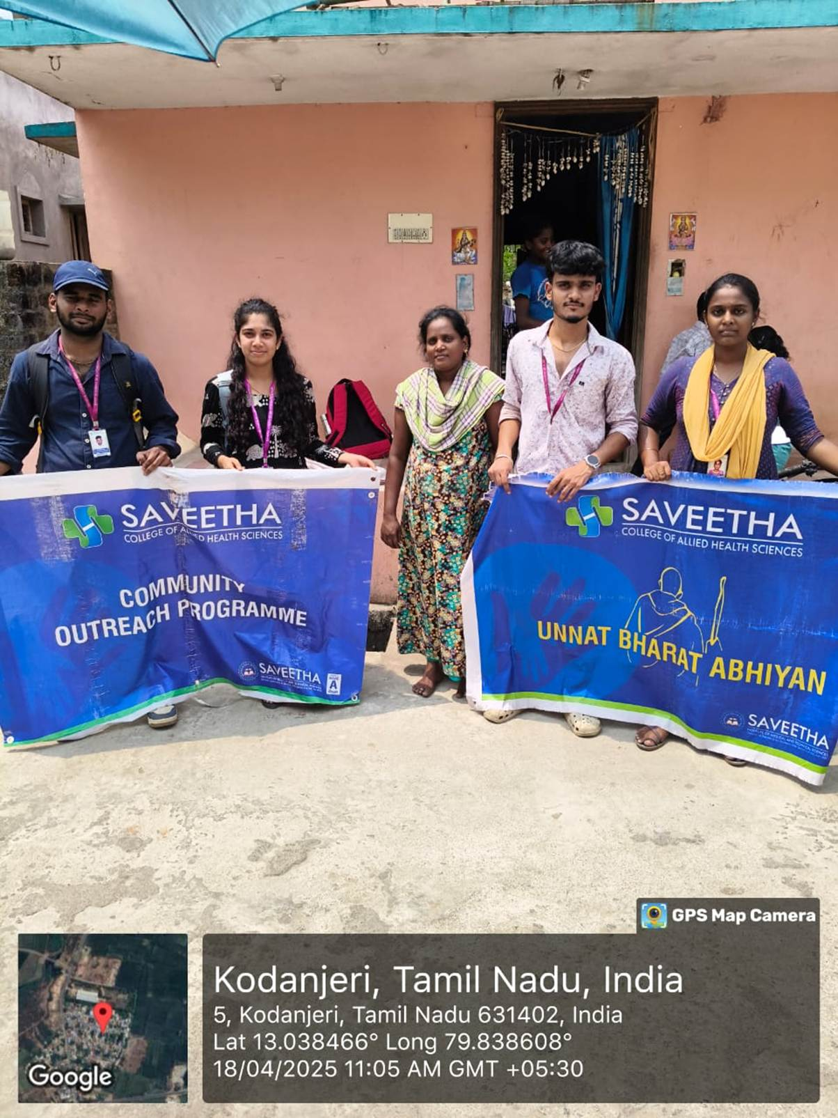 The students of Saveetha College of Allied Health Sciences along with faculty members, conducted Unnat Bharat Abhiyan Survey and community outreach programmes periodically at the Kodancherry village, Thiruvallur district. The community outreach programme was conducted as part of the Unnat Bharath Abhiyan, a flagship program of Ministry of Human Resource Development, Govt. of India. The students enquired the village residents about their family details, education, income, profession in addition to their awareness and access to various government schemes. The team from Saveetha College of Allied Health Sciences also surveyed their general & medical requirements. 480 families of the Kodancherry village benefitted from this Unnat Bharath Abhiyan survey and community outreach program. Free eye camps were also conducted at regular intervals.