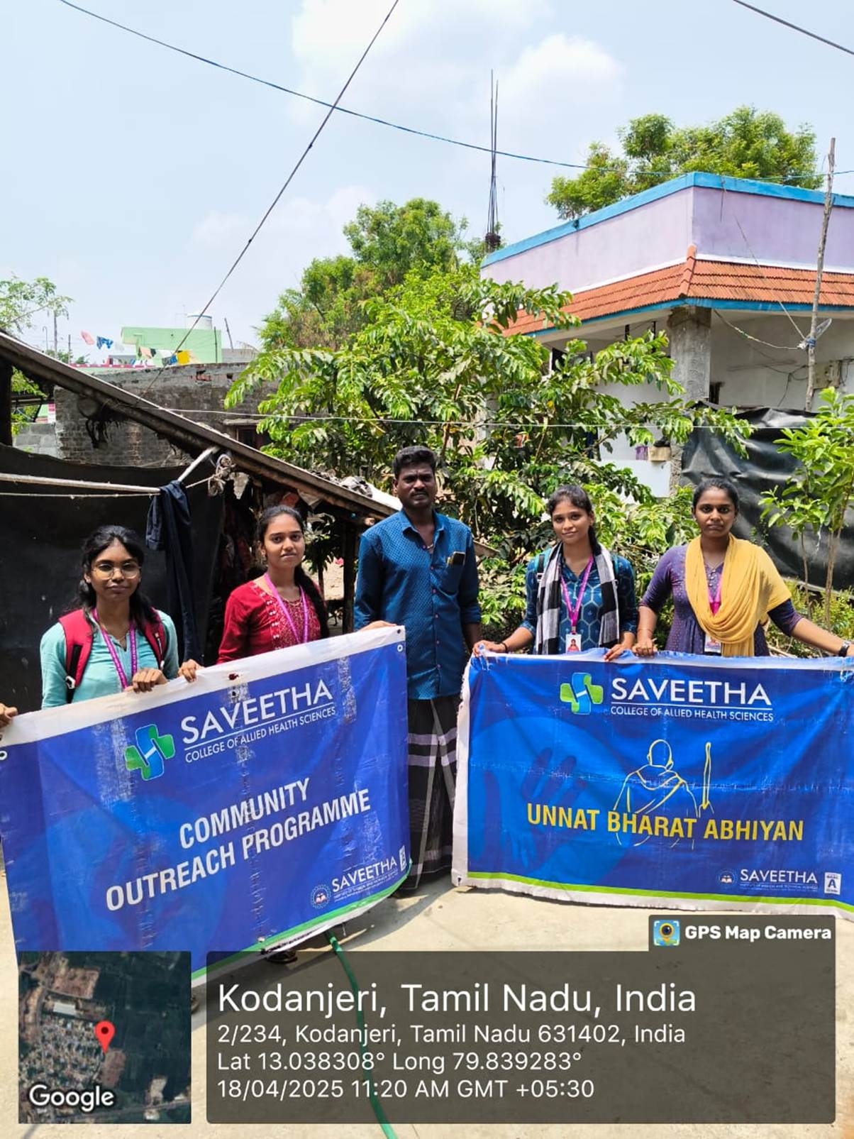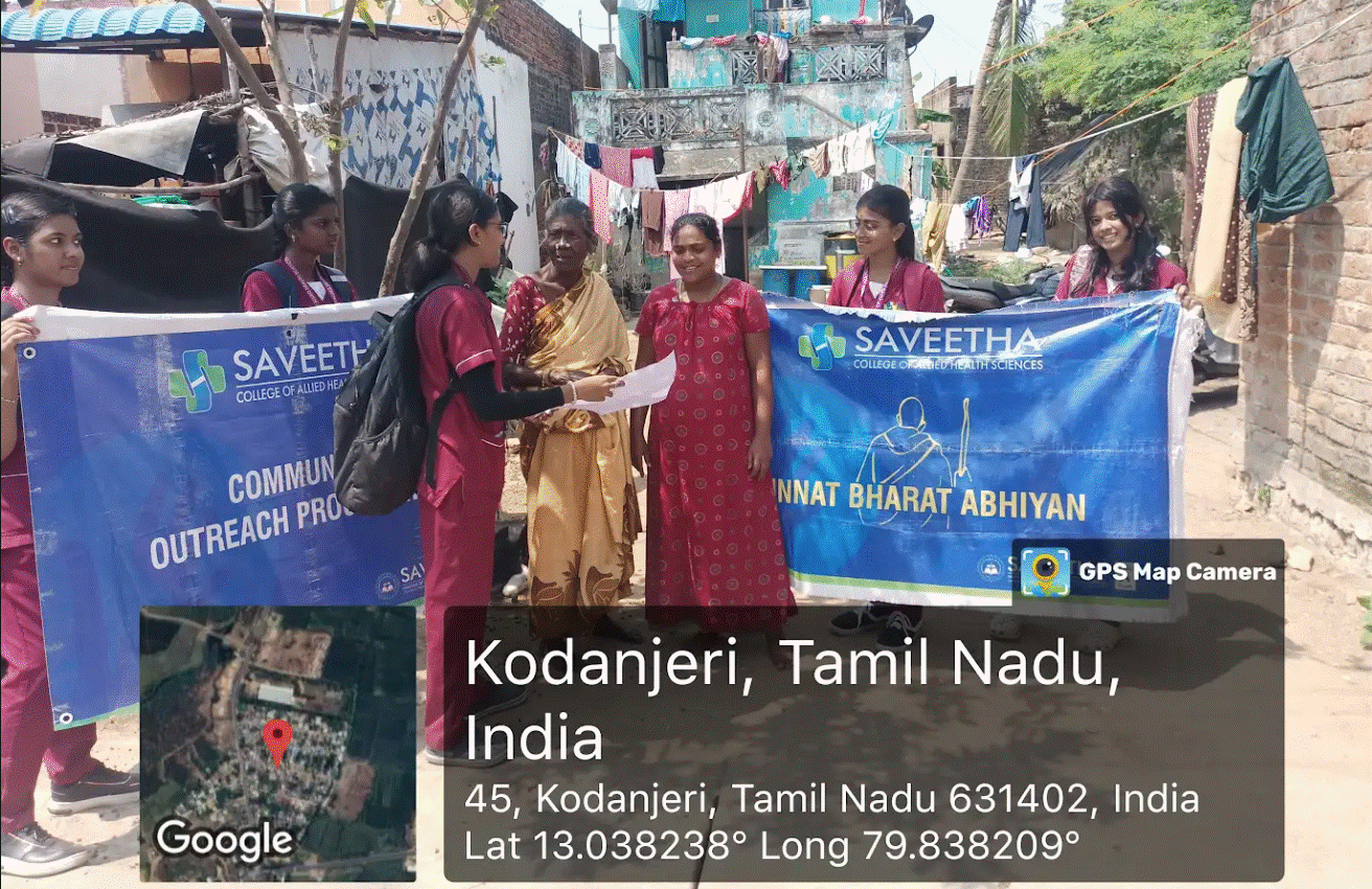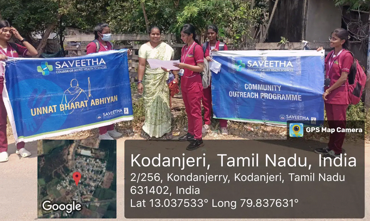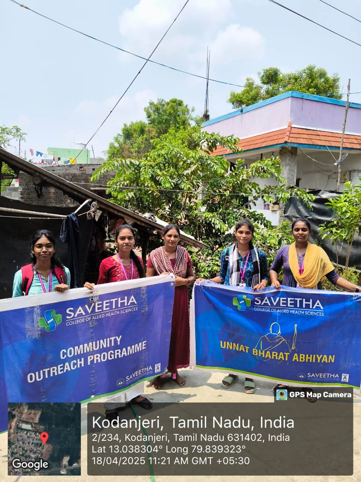 The students of Saveetha College of Allied Health Sciences along with faculty members, conducted Unnat Bharat Abhiyan Survey and community outreach programmes periodically at the Kodancherry village, Thiruvallur district. The community outreach programme was conducted as part of the Unnat Bharath Abhiyan, a flagship program of Ministry of Human Resource Development, Govt. of India. The students enquired the village residents about their family details, education, income, profession in addition to their awareness and access to various government schemes. The team from Saveetha College of Allied Health Sciences also surveyed their general & medical requirements. 480 families of the Kodancherry village benefitted from this Unnat Bharath Abhiyan survey and community outreach program. Free eye camps were also conducted at regular intervals.